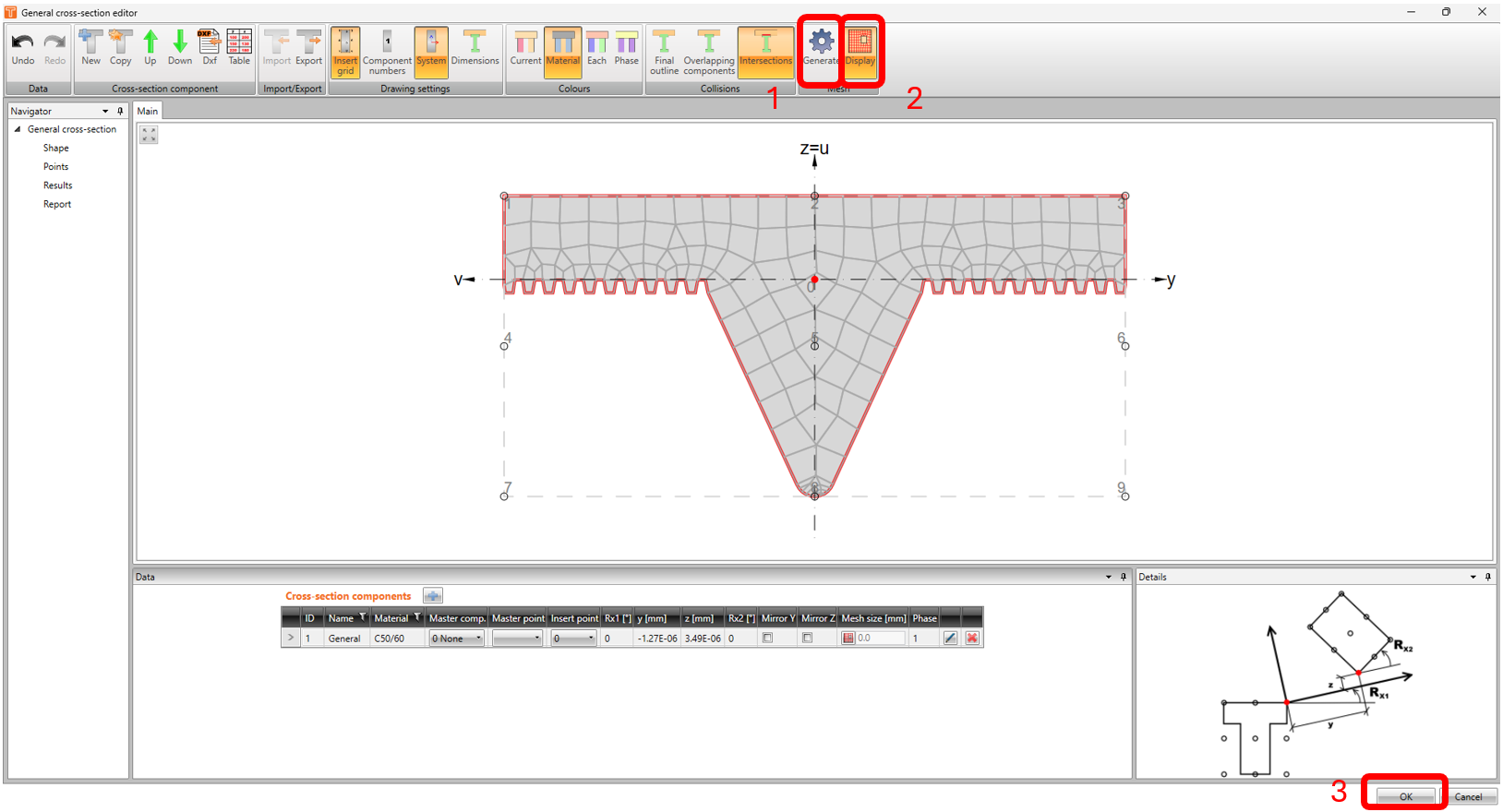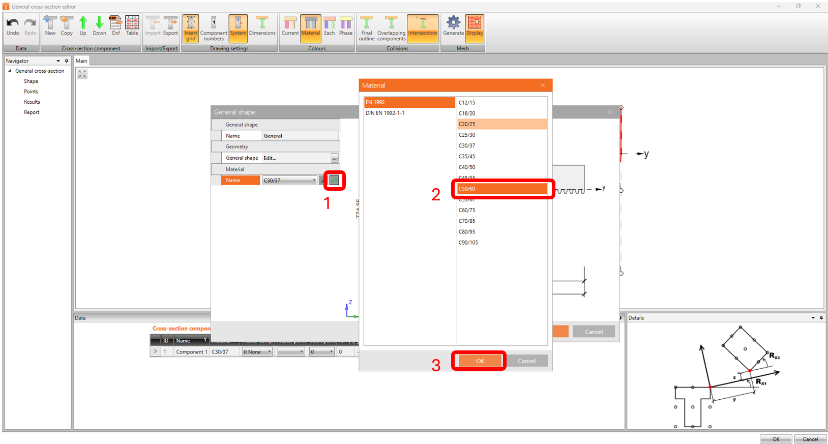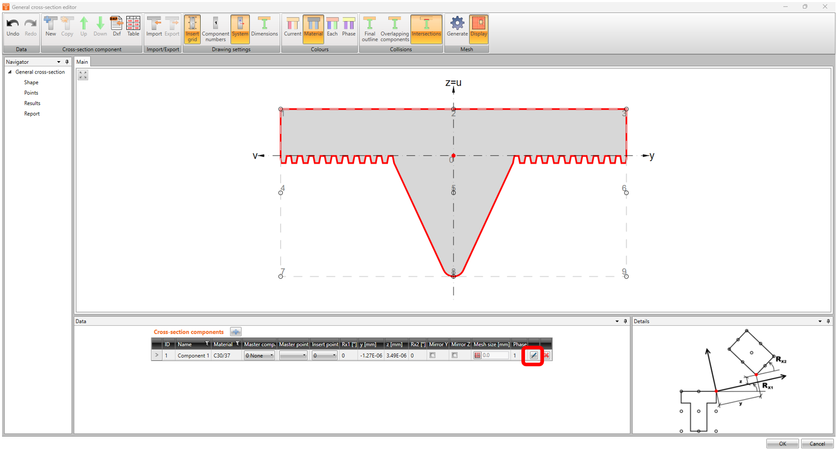 -The shape of the cross-section is now imported into the General cross-section editor. Now, we have to change the concrete material by clicking on the EDIT button under cross-section components.