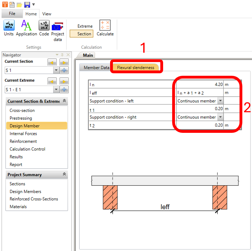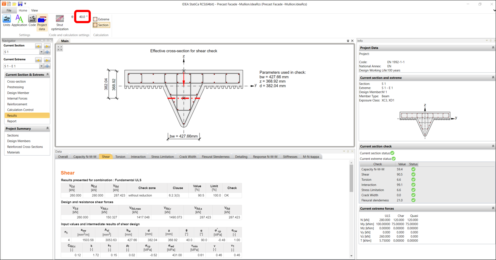 To improve the performance of the shear checks, you have the possibility to change the angle of the compression strut according to EN 1992-1-1 6.2.3 in the code and calculation settings. In this example, we’ll change the value from 45 change to 40 degrees.