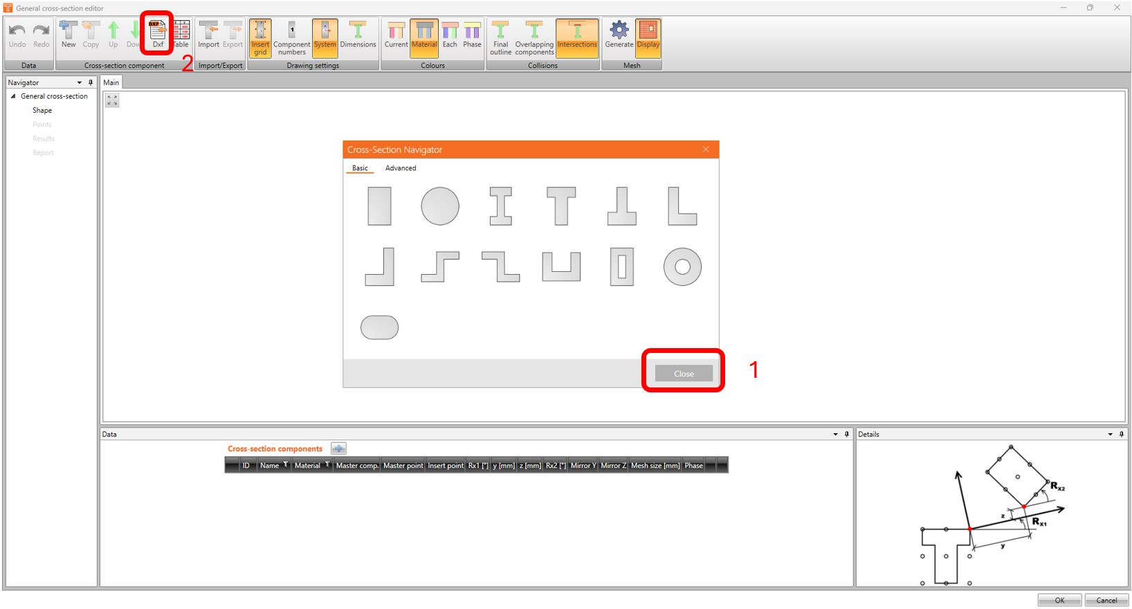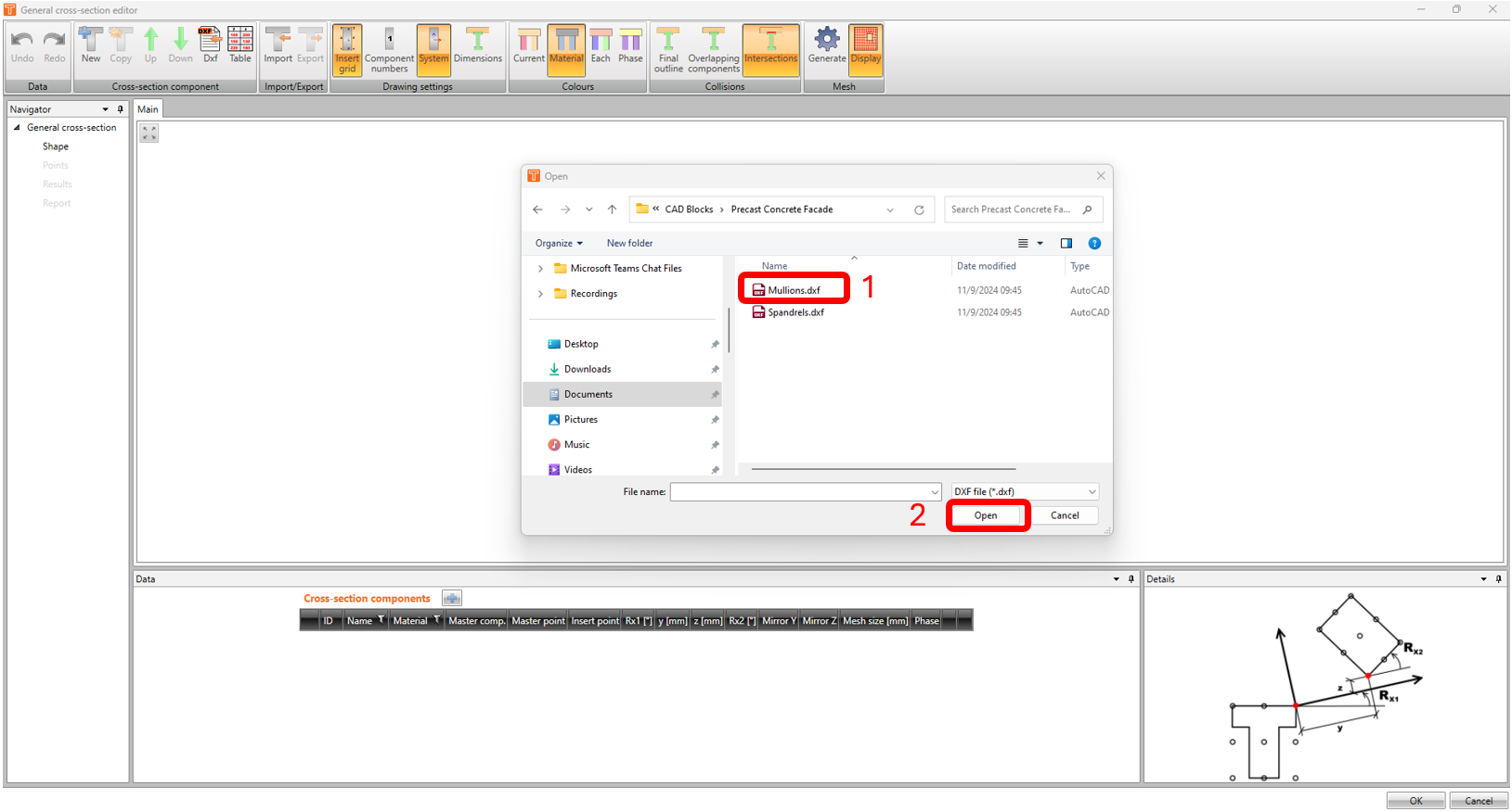 Click on IDEA CSS icon. The General Cross Section window will appear. Close the Cross Section navigator and click on DXF icon and open up "mullions.dxf" (file can be downloaded at the end of this article).