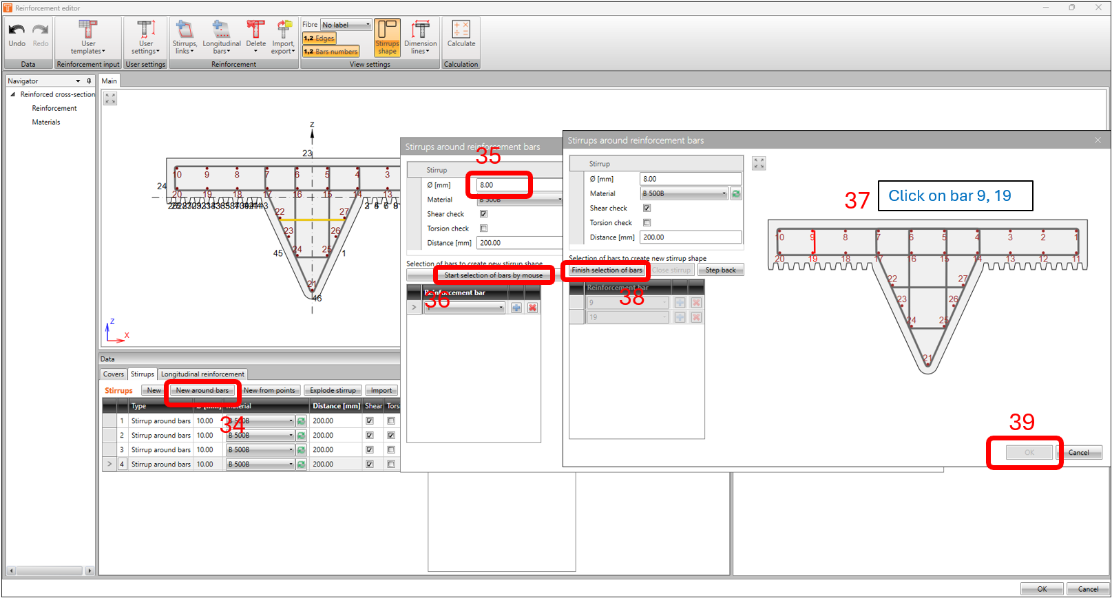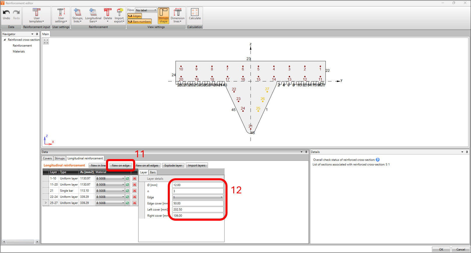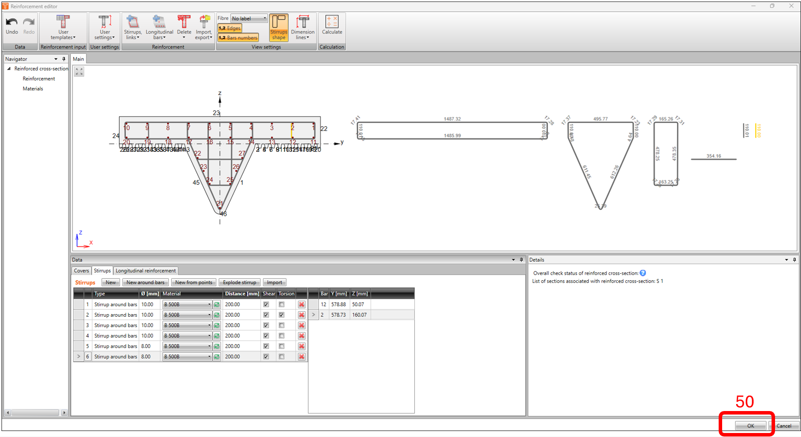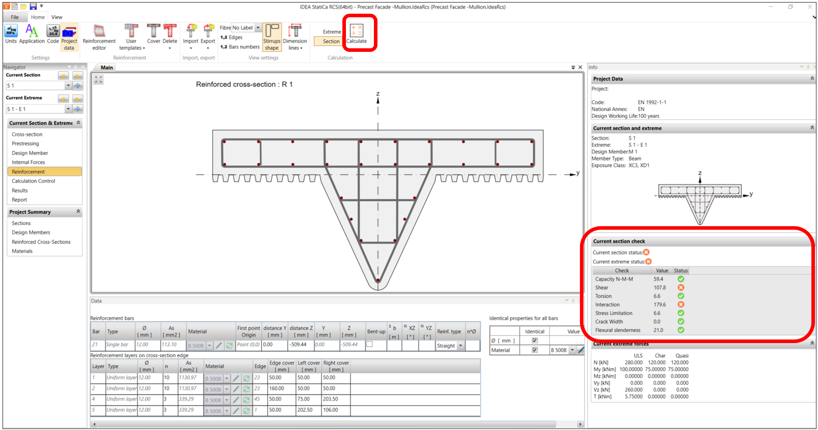 Now that we’re done with modelling the reinforcement, we’re now ready to run the calculation. Back in the reinforcement Navigator window, click on CALCULATE. In this example, the result of the calculation returns an invalid status in the verification for shear and interactions.