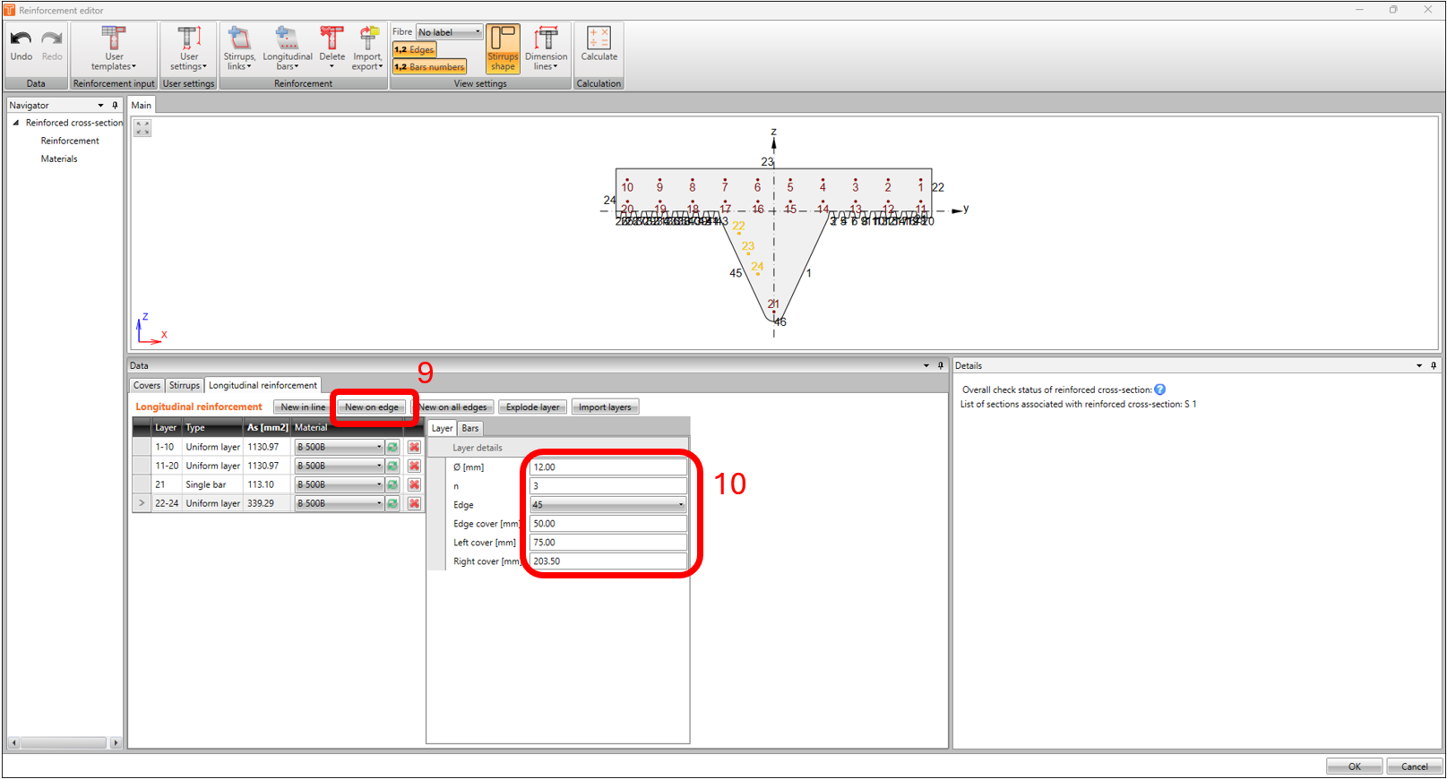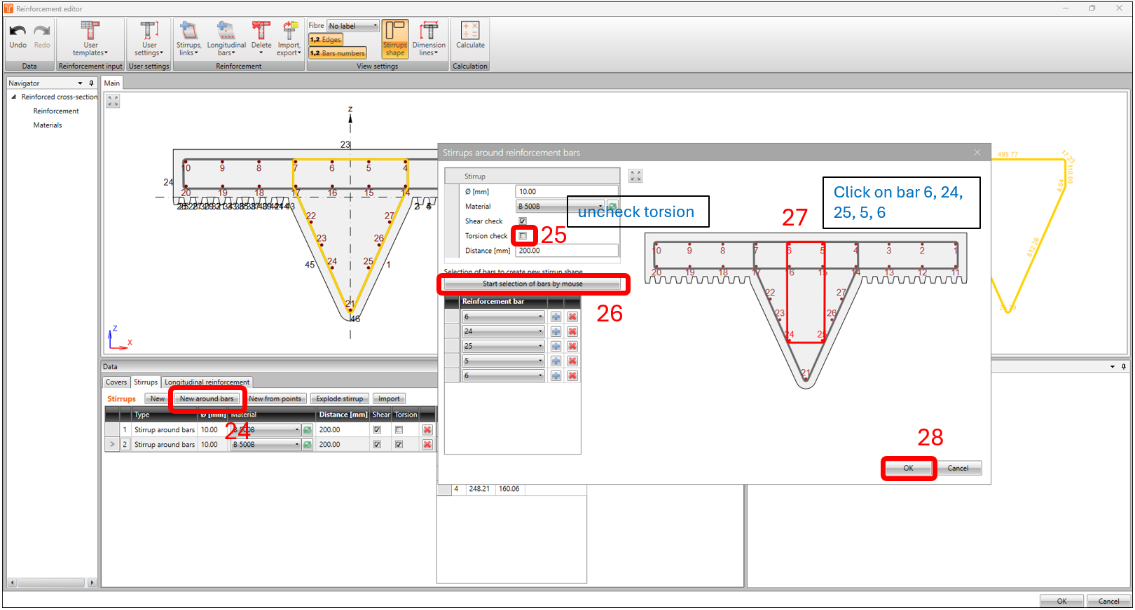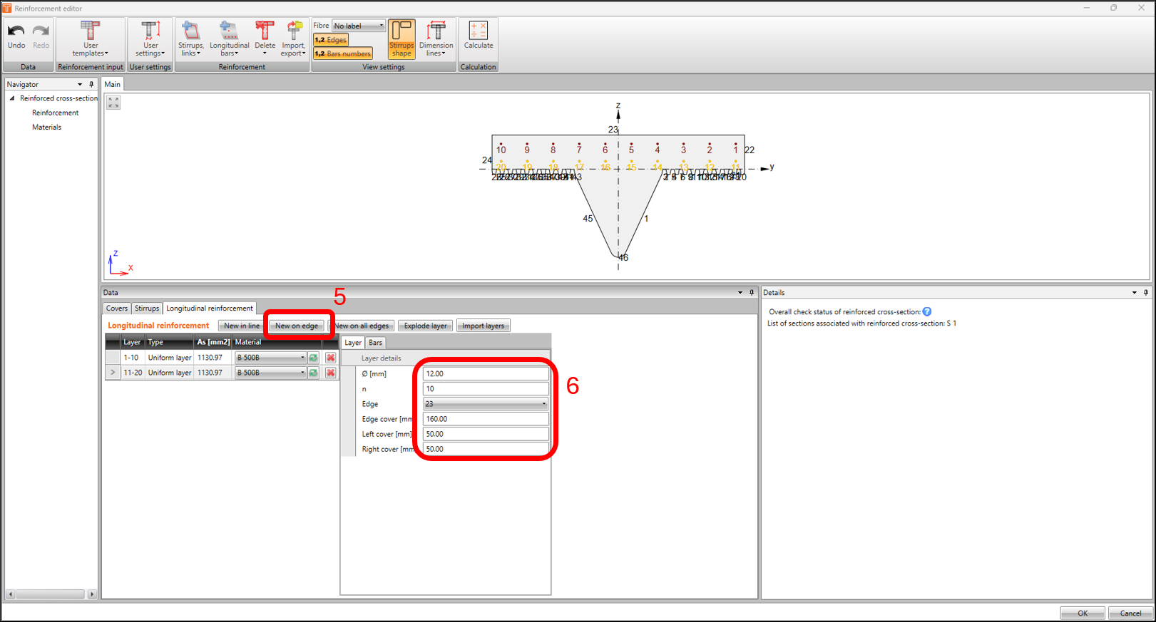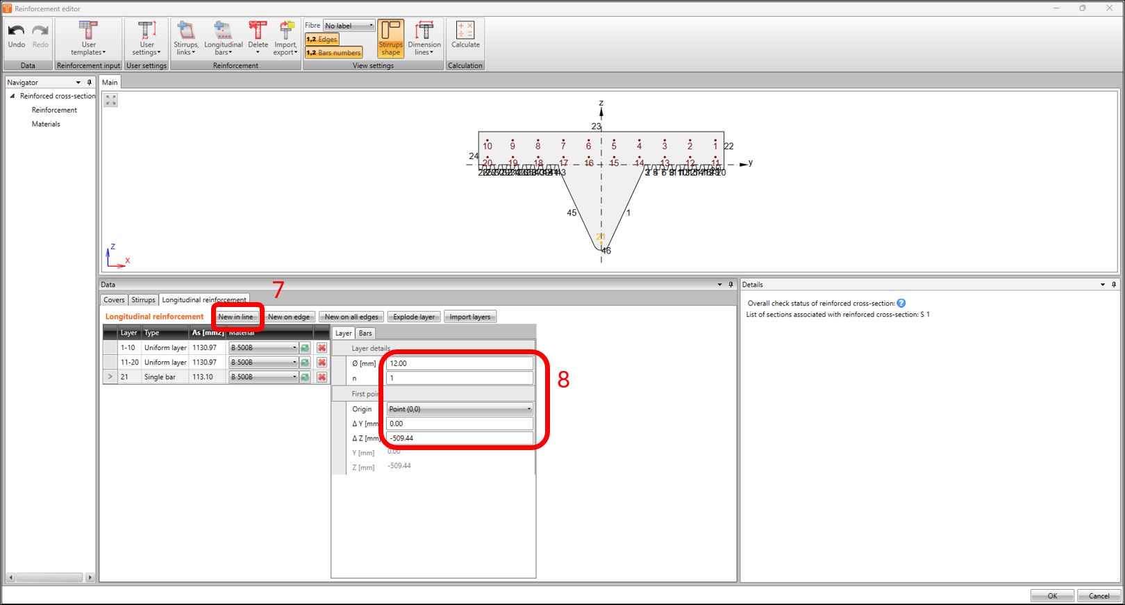 Now that we’re done with modelling the reinforcement, we’re now ready to run the calculation. Back in the reinforcement Navigator window, click on CALCULATE. In this example, the result of the calculation returns an invalid status in the verification for shear and interactions.