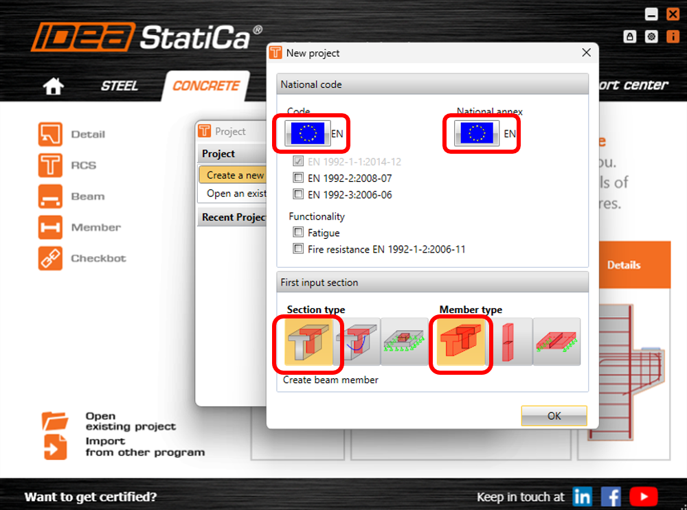 Next, you need to select the code and the national annex. In this example, we will leave the default settings to Eurocode. Select 1D REINFORCED SECTION under section type and select BEAM under member type.