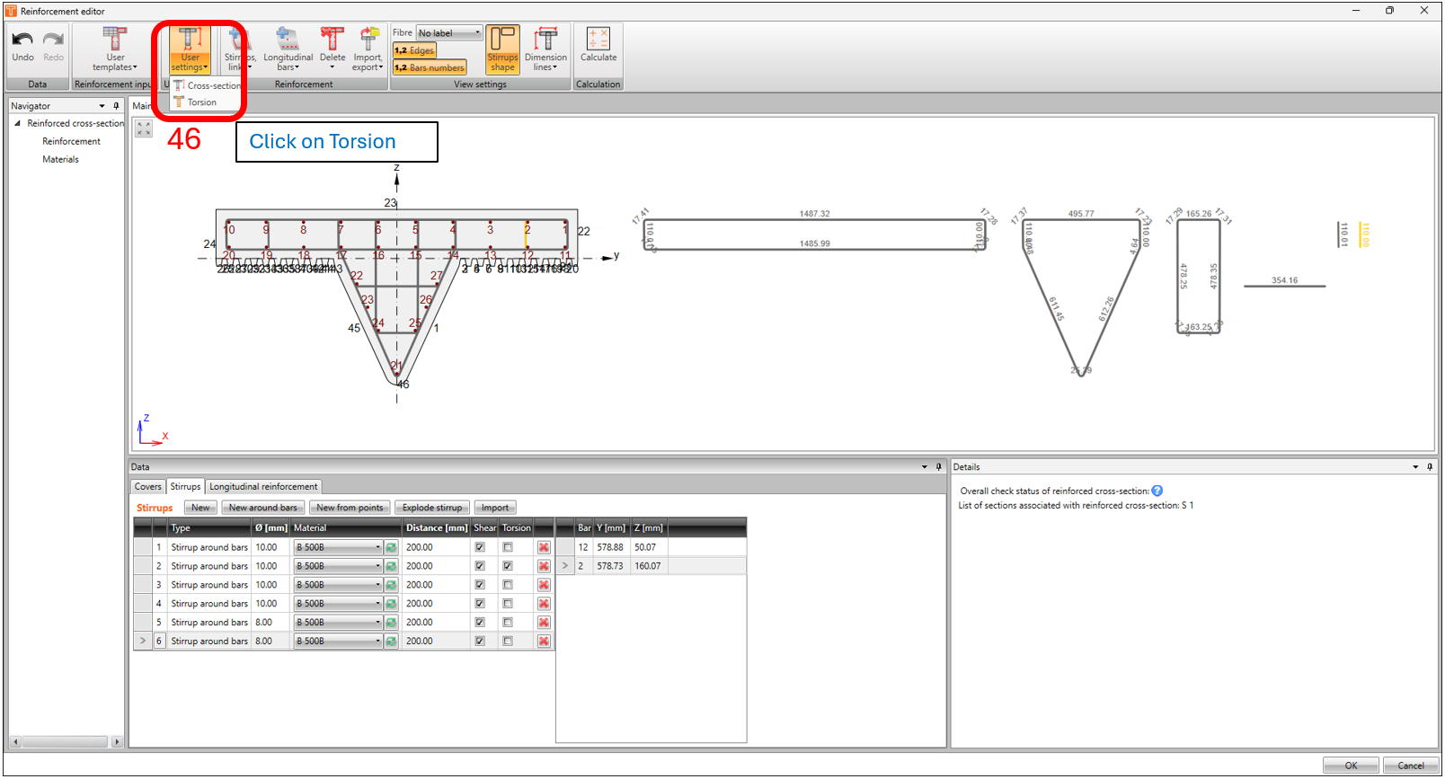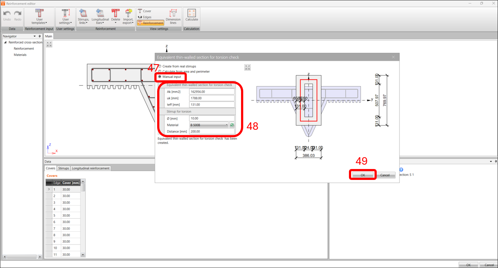 As we have an irregular shaped cross-section, we need to manually specify the equivalent thin-walled section according to EN1992-1-1 clause 6.3.2 for torsional check. This is also briefly described in this article How to set effective thin-walled section for torsion check.