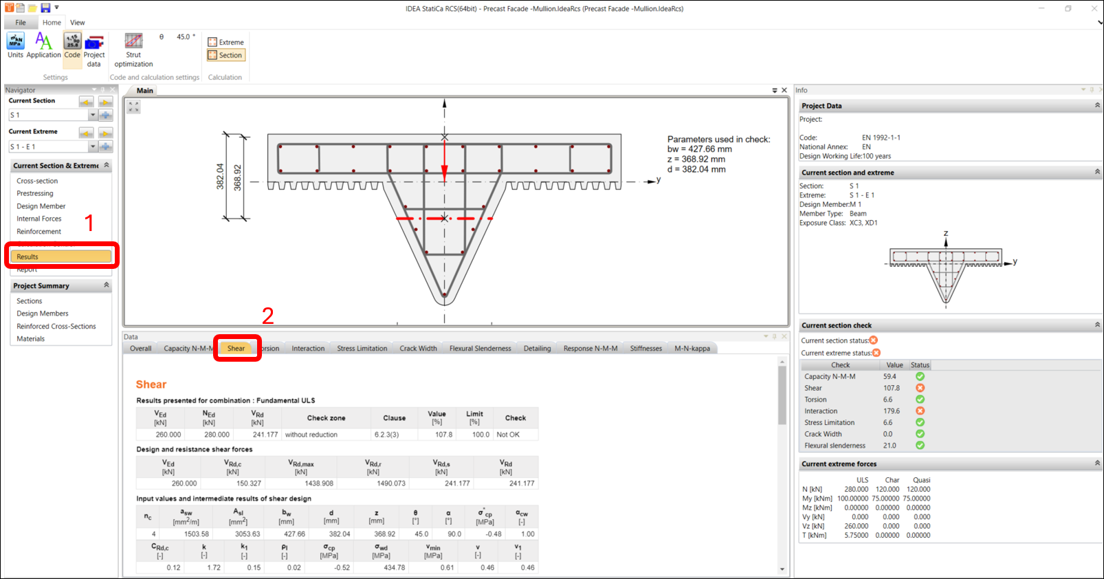 Now let’s go to the RESULTS navigator window and examine the results of the ULS and SLS checks. We need to resolve the shear checks in the SHEAR tab.