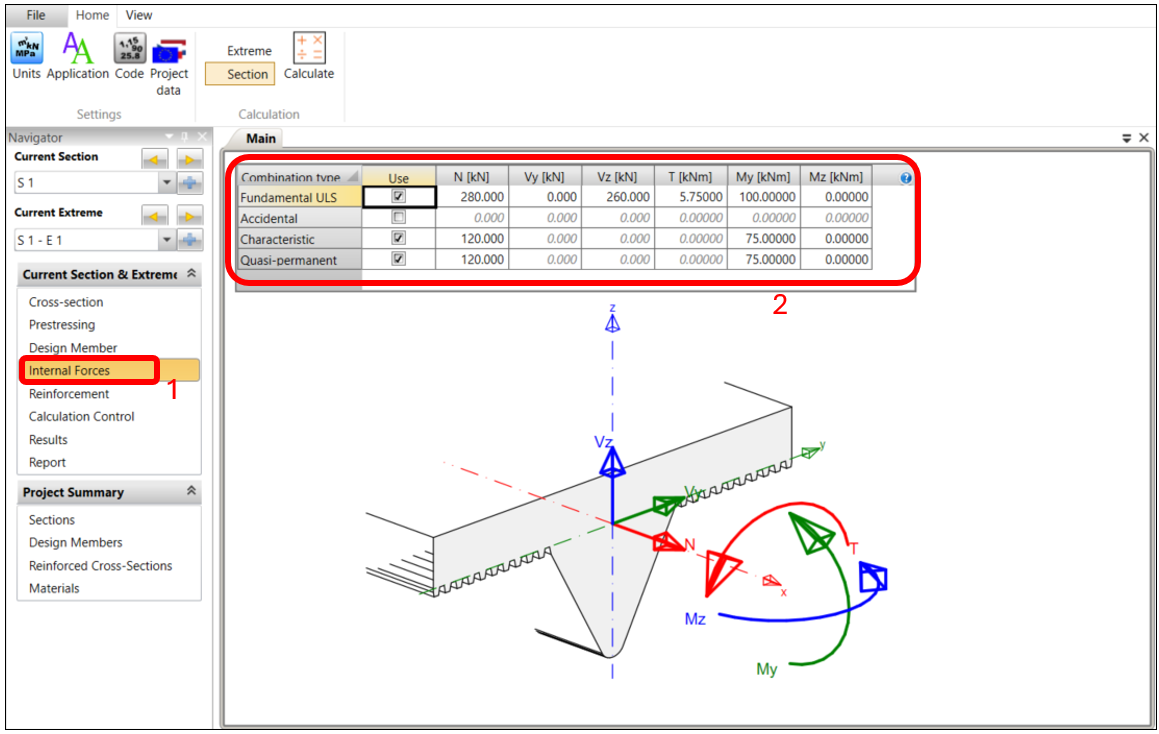 In the Internal Forces Navigator window, apply the values of the internal forces as below (These values should come from your global analytical FEA model). Note that in this example, the applied axial force (N) is in tension as the structure is hanging with other elements attached to it.