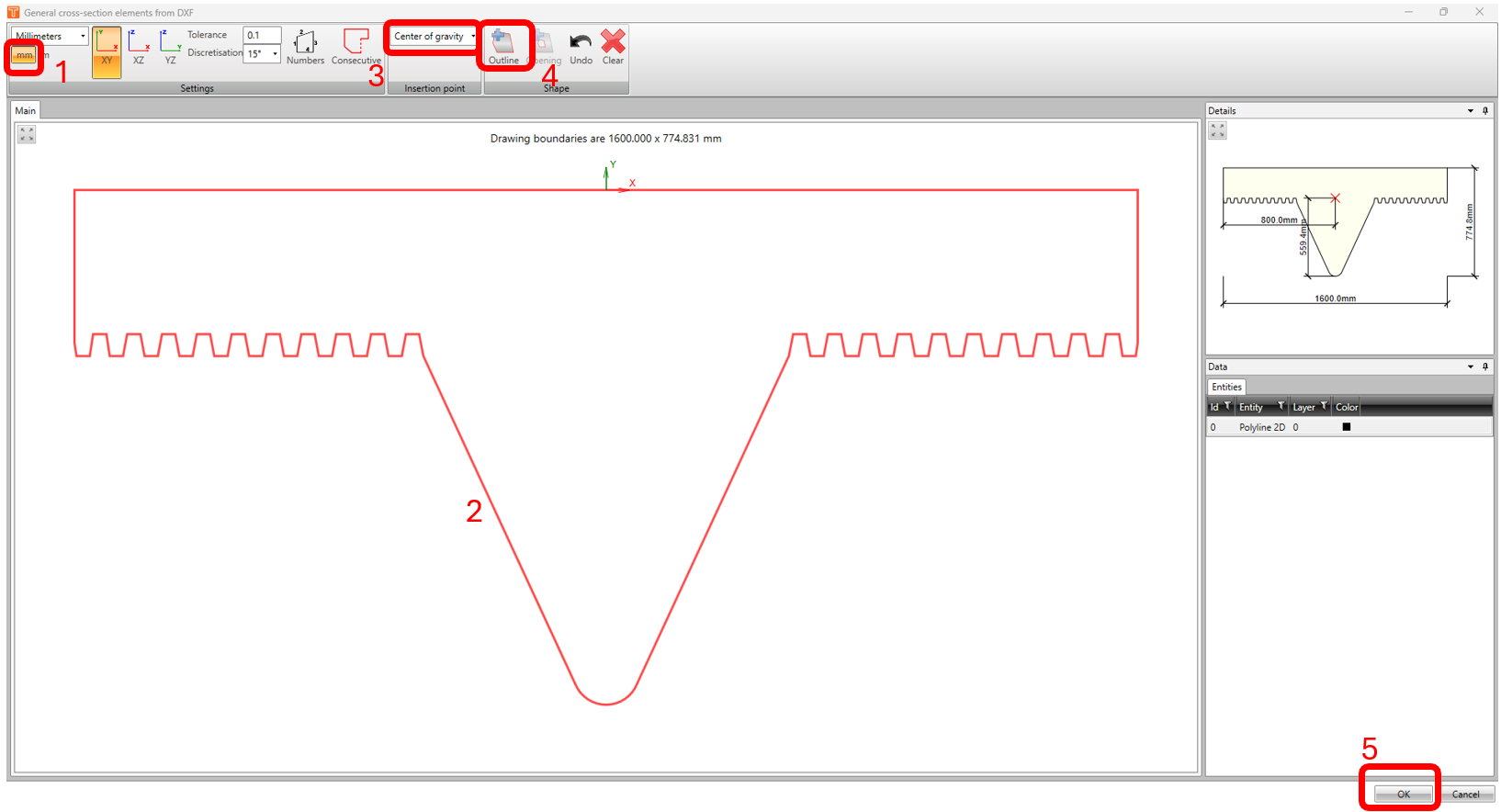In the General cross-section elements from dxf window, choose the correct units in millimeters. Click on the shape of the precast element. Under insertion point, select CENTER OF GRAVITY in the dropdown list. Select OUTLINE before hitting OK.