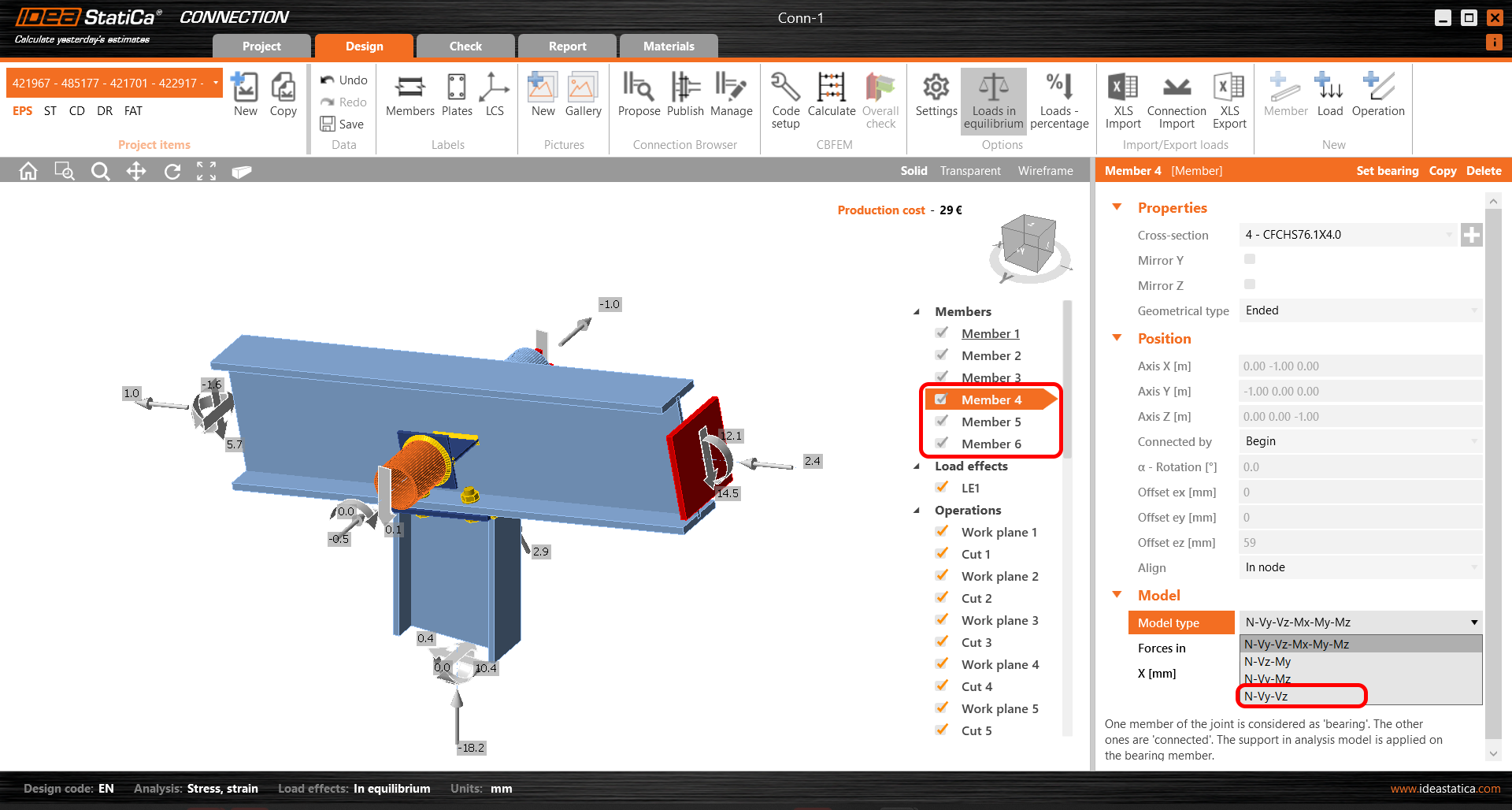 Wir werden eine einzelne Verbindung mit einer Schraube für den Abstand und ein diagonale Aussteifungsbauteil verwenden. Für diese Art der Verbindung müssen wir auch den Modelltyp der Streben auf N-Vy-Vz ändern. Wählen Sie die Bauteile in der Bauteilliste aus und ändern Sie den Modelltyp in der Dropdown-Liste.