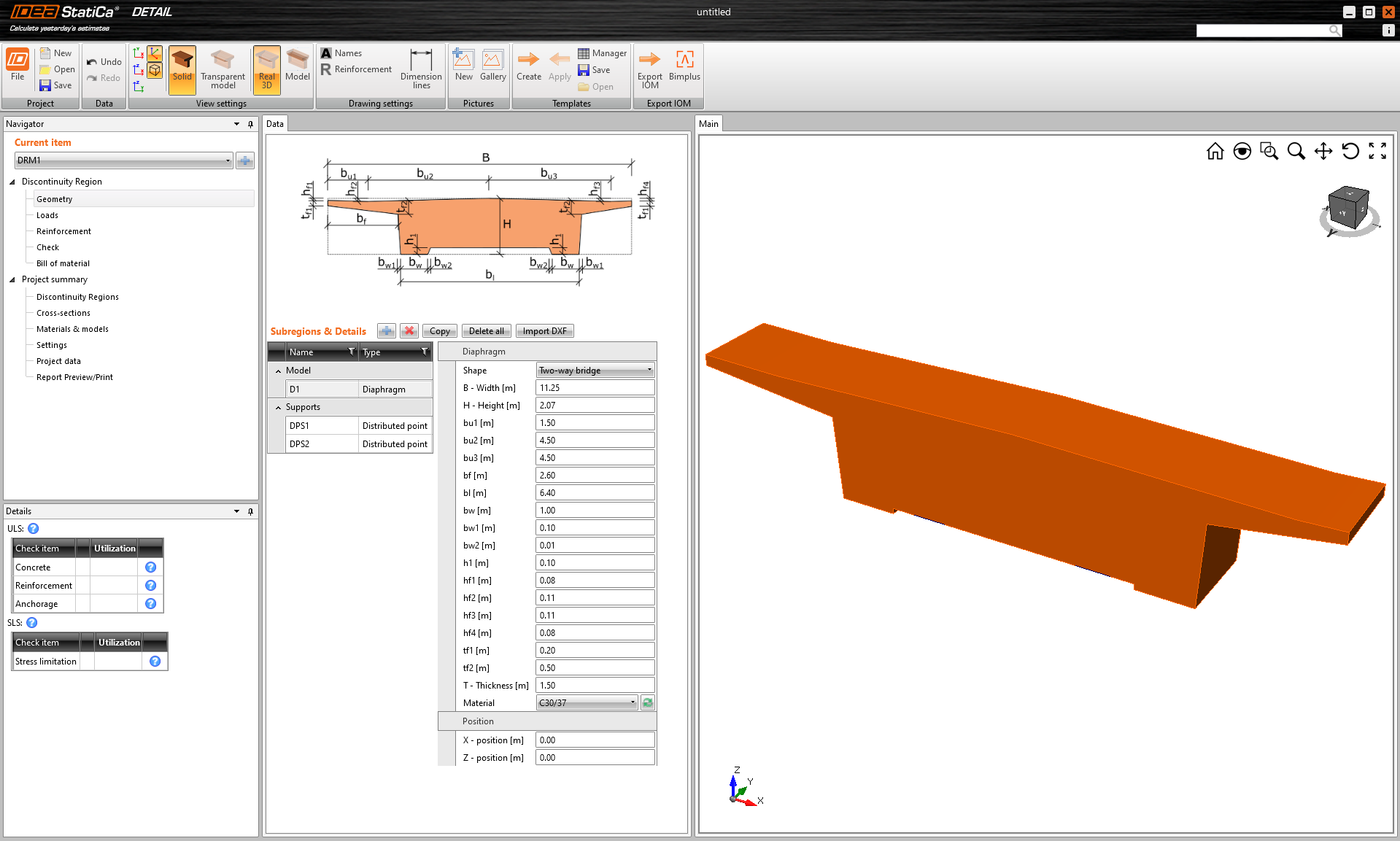Brückenquerschnitte sind eigentlich vordefinierte Wände. Es gibt drei Möglichkeiten, die Form zu definieren. Zweiwegebrücke, Autobahnbrücke und allgemein (durch Polylinie). Auch der Import aus der Dxf-Datei ist möglich. Wände und Brückenquerschnitte können in einem Modell kombiniert werden. Das liegt daran, dass sie vom gleichen Typ sind.