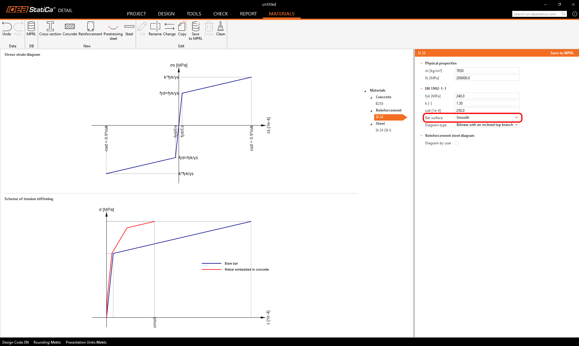 Der Wechsel des Bewehrungstyps ist auf der Registerkarte Material möglich, wo Sie zwischen zwei Optionen wählen können: Gerippt zu Glatt.