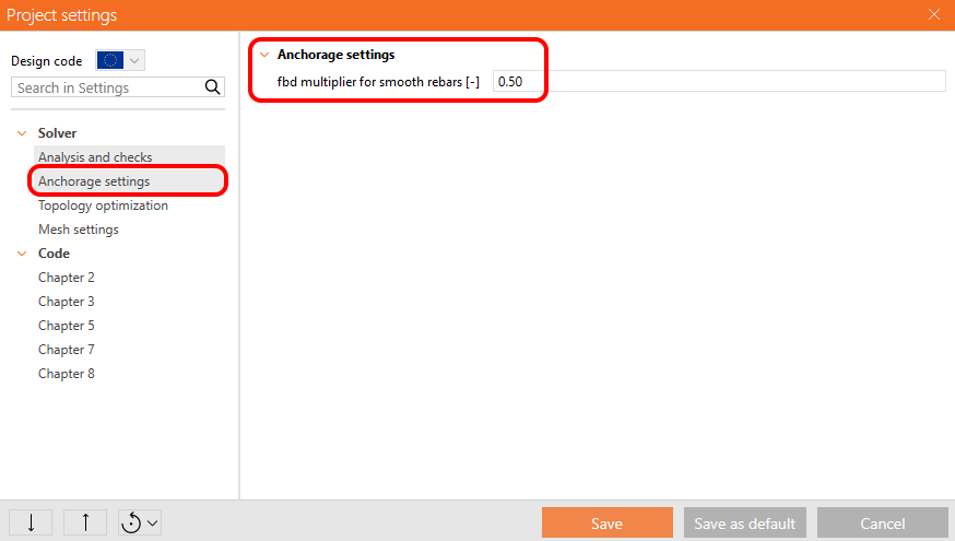 Aus Gründen der Konsistenz wird die gleiche Abminderung, die in jedem Bemessungscode auf die Verbundfestigkeit angewandt wird, auch für die Skalierung des Verankerungsbeiwerts β im CSFM-Modell (Compatible Stress Field Method) verwendet. Dadurch wird sichergestellt, dass die Verankerungstypen, gerader Stab, Haken, Schlaufe usw., korrekt angepasst werden, wenn glatte Bewehrungsstäbe ausgewählt werden.