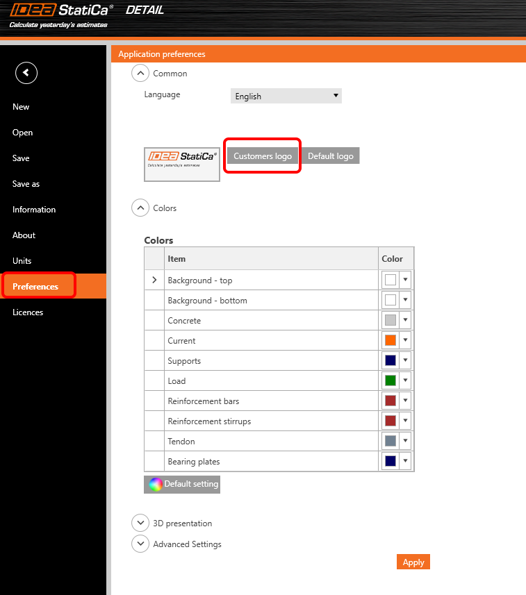 - Die Fußzeile im unteren Teil der Anwendung enthält grundlegende Informationen zu den Projekteinstellungen, wie z. B. den Bemessungsnorm, Rundungseinheiten, Darstellungseinheiten und einen Link zu unserer Webseite. Durch Anklicken dieser Elemente wird das Dialogfenster mit den entsprechenden Einstellungen geöffnet, das die Definition einer ausgewählten Gruppe von Parametern ermöglicht.