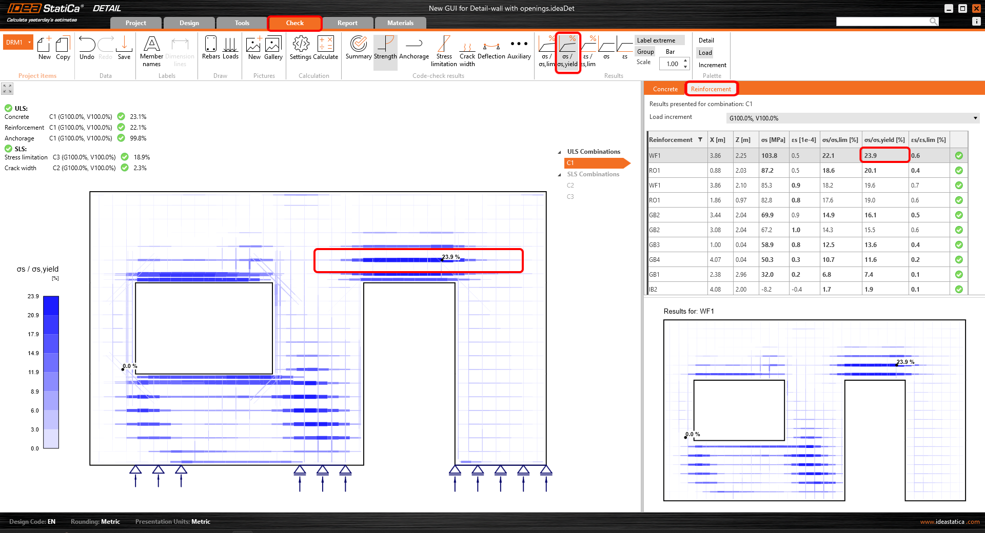 - Die Ergebnisse für jeden Materialtyp werden in der Darstellung separat angezeigt. Der Benutzer kann auswählen, welche Ergebnisse angezeigt werden sollen, indem er die Registerkarte Beton, Bewehrung oder Spannglied im Eigenschaftsfenster auswählt.