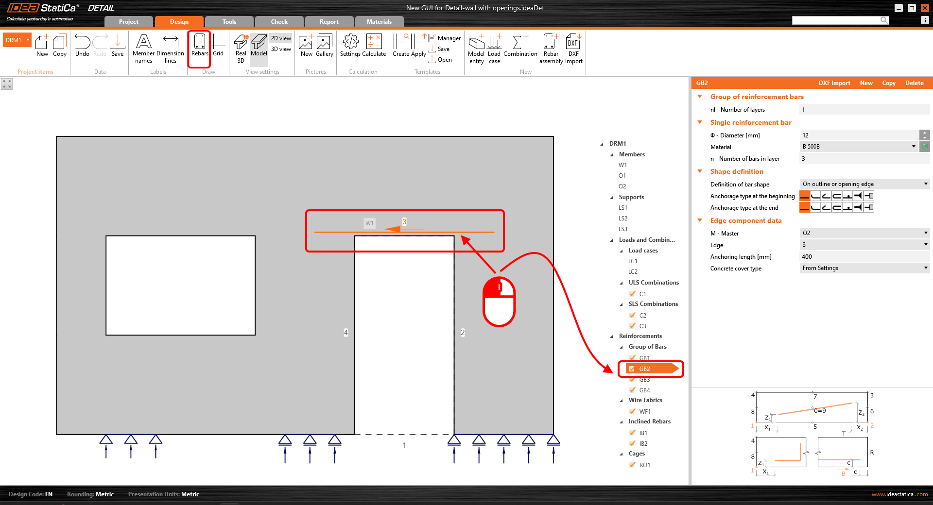 - Die Schaltfläche "Bewehrungstäbe", deren Funktion im Abschnitt Entwurf beschrieben ist, kann auch hier verwendet werden.