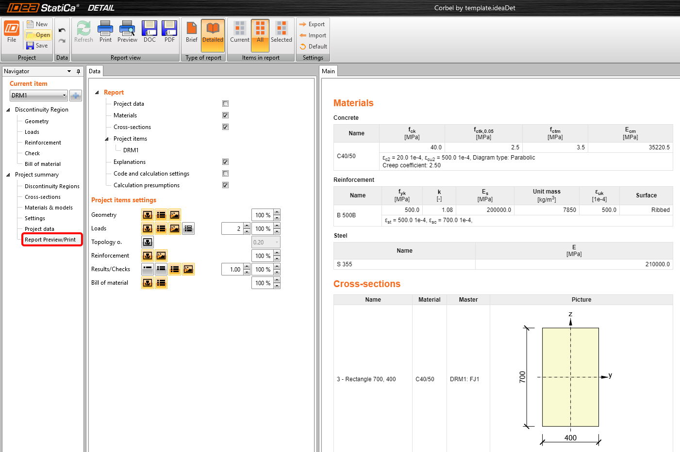 Gehen Sie zuletzt zu Berichtsvorschau/-druck. IDEA StatiCa bietet einen vollständig anpassbaren Bericht zum Ausdrucken oder Speichern in einem bearbeitbaren Format an.