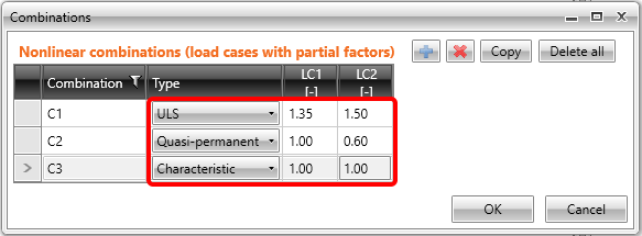 Stellen Sie die Kombination C1 als GZT-Kombination, C2 als quasi-ständige GZG-Kombination und C3 als charakteristische GZG-Kombination ein. Die Teilfaktoren sind gemäß der folgenden Tabelle einzustellen: