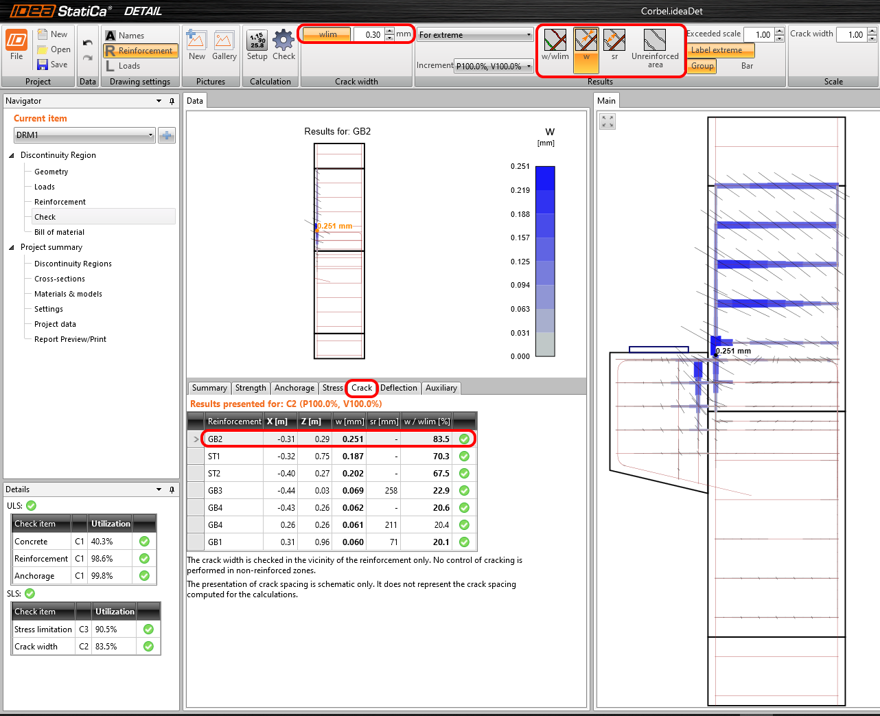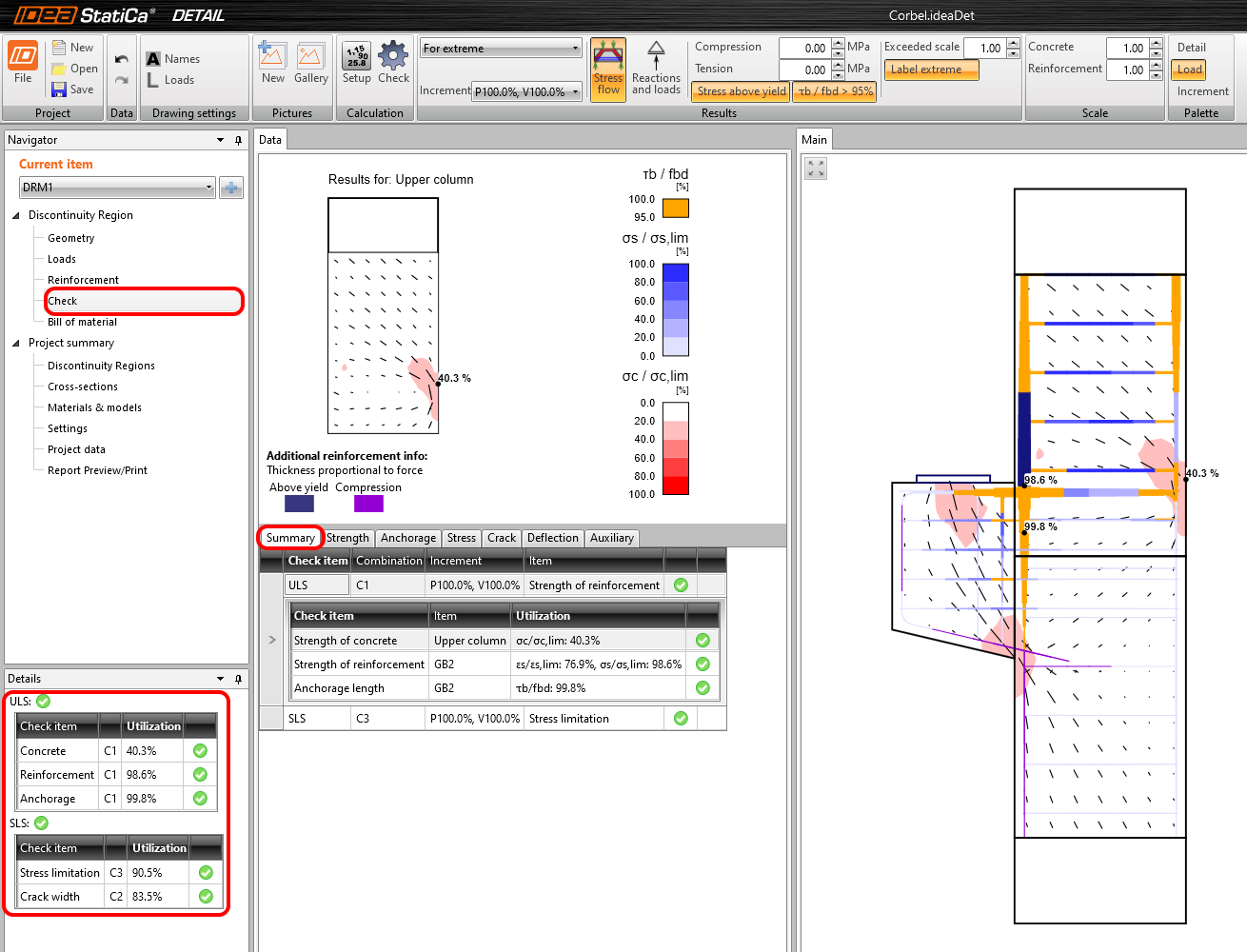 Das Berechnungsmodell wird automatisch generiert, die Berechnungen werden durchgeführt und Sie können die Übersicht der Nachweise zusammen mit den Werten der Nachweisergebnisse anzeigen.