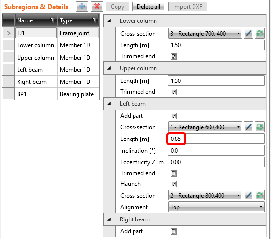 Ändern Sie die Länge des linken Trägers auf 0,85 m.