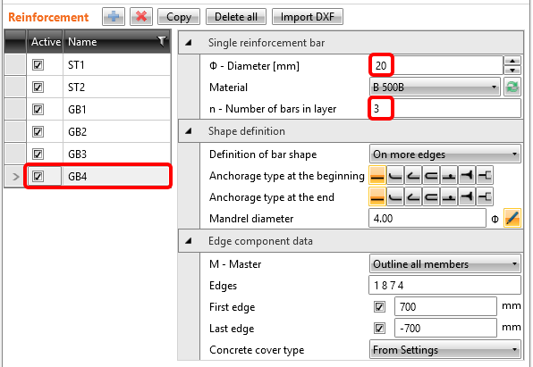 Ändern Sie in der Gruppe GB3 die Anzahl der Lagen auf 5, deren Abstand auf 120 mm und den Durchmesser der Stäbe auf 8 mm.