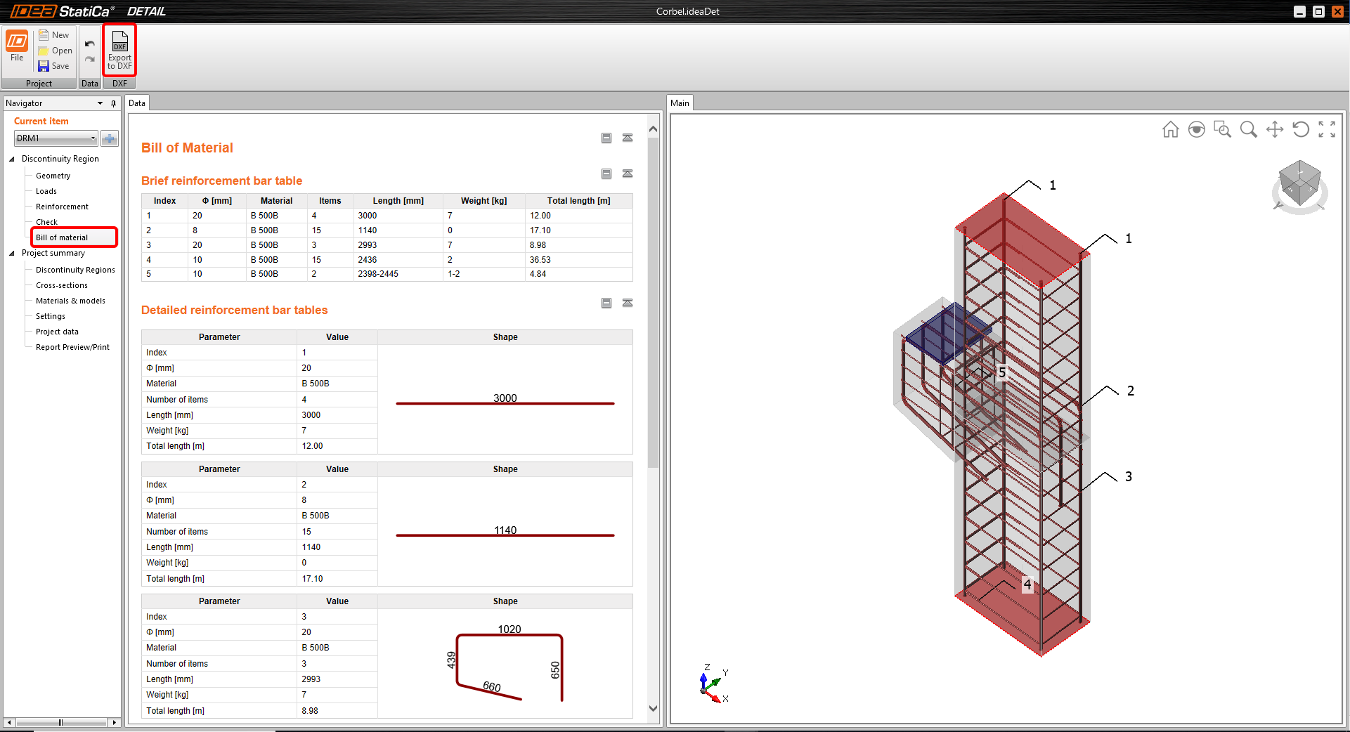 Gehen Sie nun zur Materialliste. Sie können es als DXF exportieren und weiter bearbeiten – die gesamte Bewehrung wird in Blöcke exportiert, die in Polylinien aufgelöst werden können.