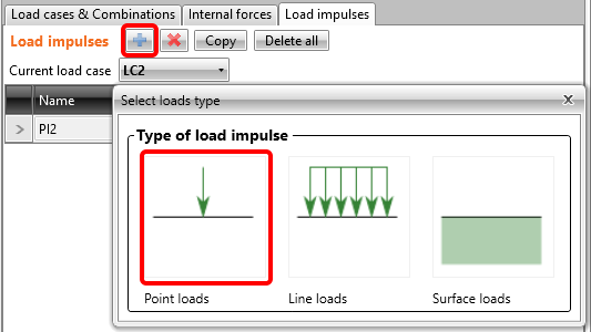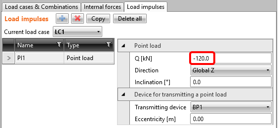 Ändern Sie den automatisch hinzugefügten Lastfall LC1 für ständige Einwirkungen. In der Tabelle Lastimpulse sehen Sie eine Punktlast, die auf die Lagerplatte angewendet wurde.