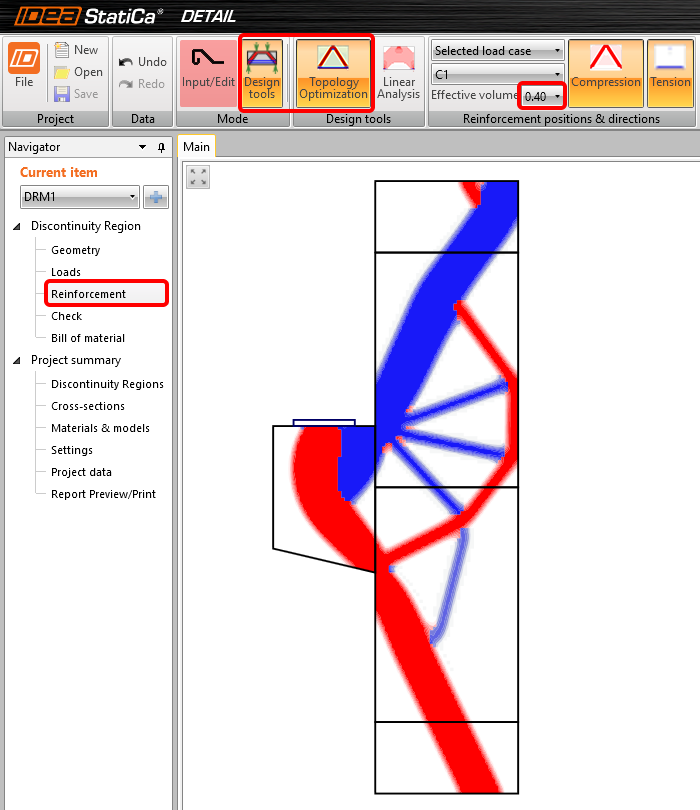 Der nächste Schritt besteht darin, das Modell zu verstärken. Wir werden die Bewehrung in der Vorlage bearbeiten, aber zuerst schauen wir uns die Topologieoptimierung in den Bemessungswerkzeugen an. Die Berechnung verwendet ein wirksames Volumen des Bauteils (in unserem Fall beispielsweise 40%) und platziert dieses Volumen auf die wirksamste Weise, sodass die erstellte Struktur die steifste ist.