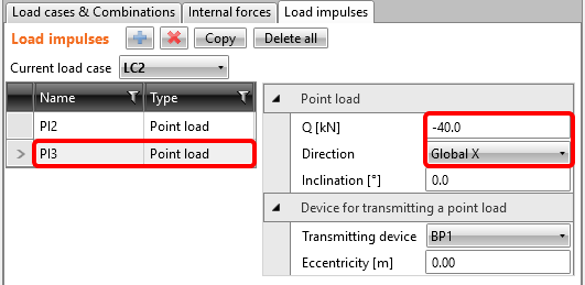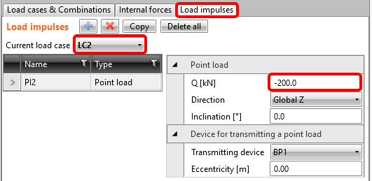 Wechseln Sie zurück zu Lastimpulse, um den veränderlichen Lastfall LC2 zu ändern, indem Sie den Wert der vertikalen Punktlast auf -200 kN ändern.