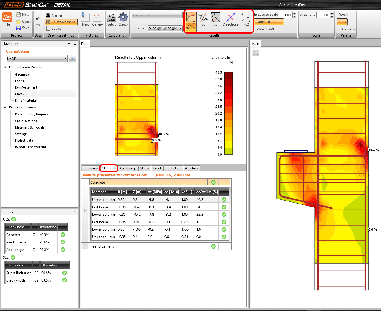 Beginnen Sie mit der Tabelle Festigkeit, um die detaillierten Nachweise jeder Komponente durchzuführen. Diese zeigt die Betonnachweise wie Spannungsausnutzung, Richtung der Hauptspannungen, Dehnungen sowie eine umschaltbare Karte des Reduktionsfaktors kc an.
