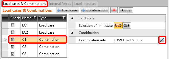Gehen Sie zurück zu Lastfälle & Kombinationen und wählen Sie die Kombination C1 aus. Wenn Sie auf das Stiftsymbol klicken, können Sie die Kombinationsregeln ändern.