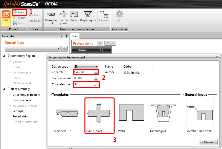 Erstellen Sie ein neues Projekt, indem Sie auf Neu klicken. Das Assistenten-Fenster wird geöffnet und Sie können mit der Auswahl der richtigen Betonklasse und -deckung beginnen. Fahren Sie dann mit Rahmenverbindungen in den Vorlagen fort.