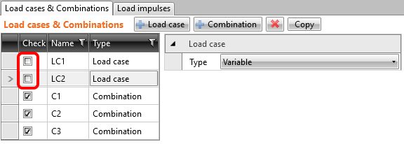 Beachten Sie die deaktivierten Kontrollkästchen für Lastfälle. Die Berechnungen werden nur für die angekreuzten Positionen durchgeführt und durch den Ausschluss der Lastfälle beschleunigen Sie die Berechnung. Setzen Sie die Häkchen nur für die drei Kombinationen.