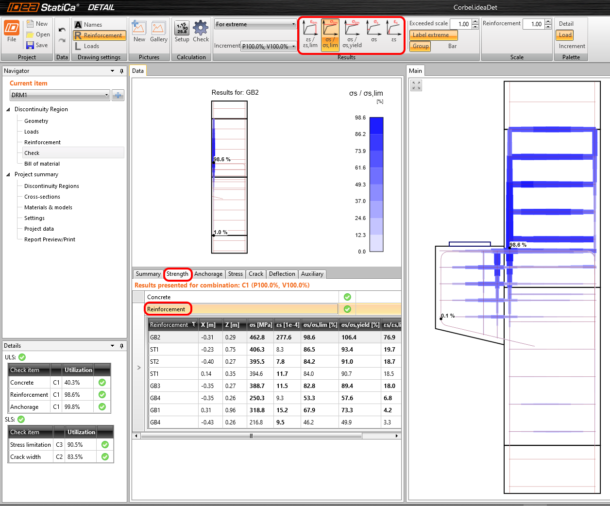 Für detaillierte Bewehrungsergebnisse müssen Sie auf die Zeile Bewehrung klicken. Dadurch werden die Symbole im Programmbereich geändert und die Tabelle für Ergebnisse erweitert. Sie können sich Ergebnisse für Dehnungen und Spannungen in jedem Stab und deren Ausnutzung anzeigen lassen.