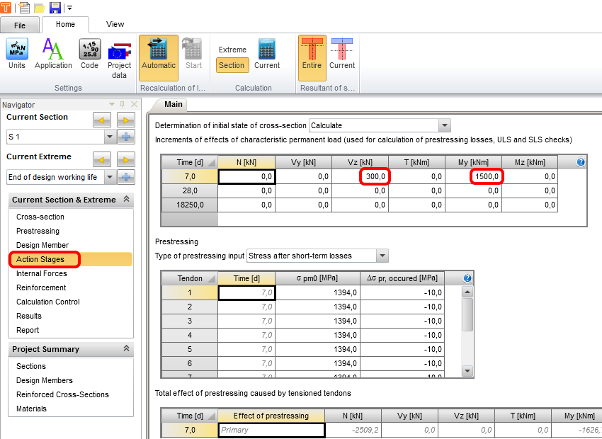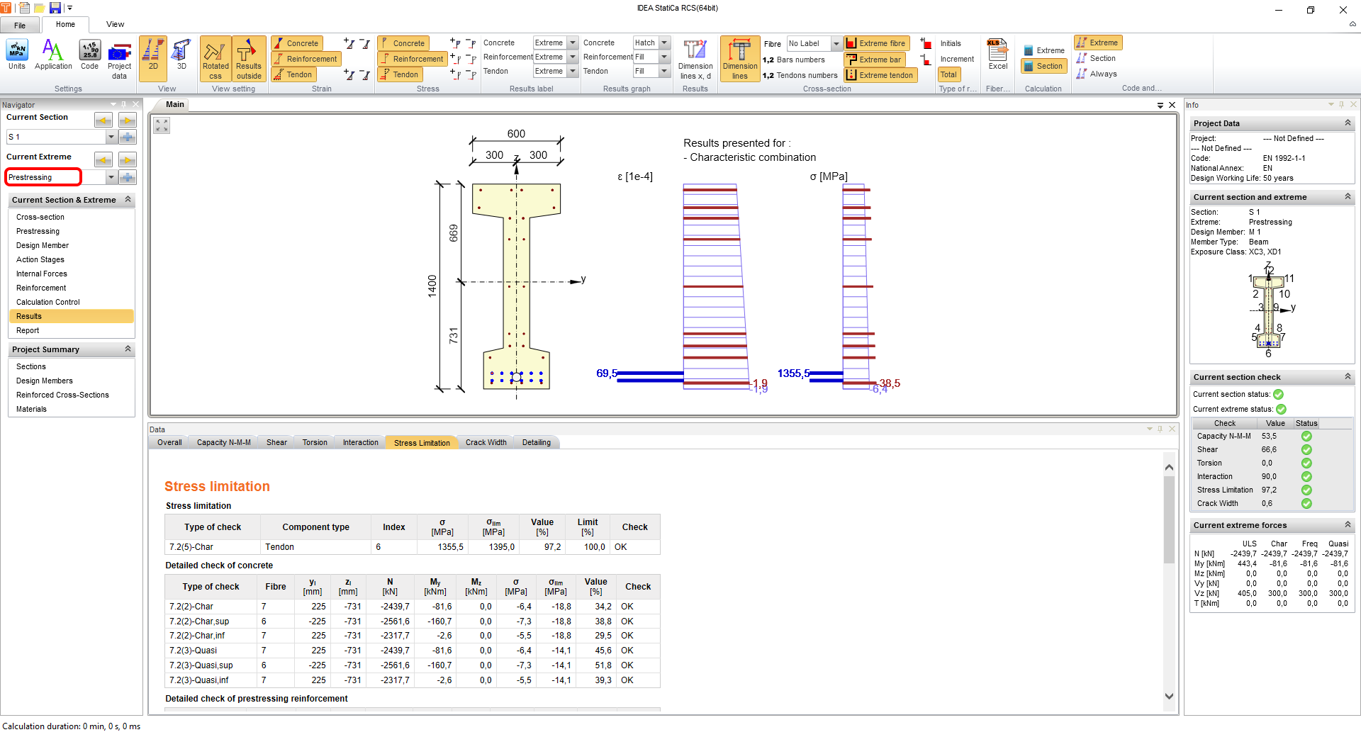 On the other hand, you can expect the opposite fibers to be extreme without variable load. Switch Current extreme to Prestressing and all results will be displayed.