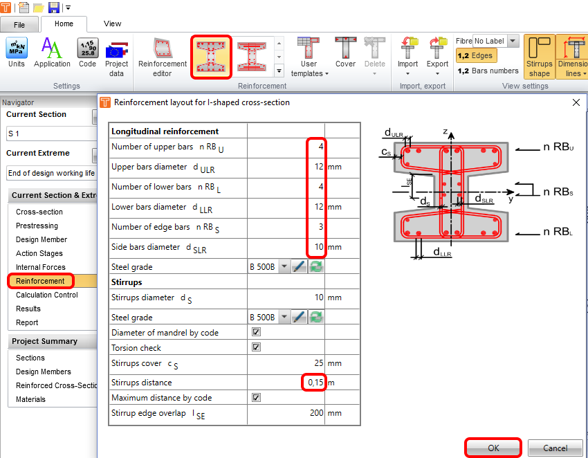 Before the checks, you need to reinforce the section. The best option in cases of rectangular, T and I-sections is to use a template. Adjust its properties according to the screenshot.