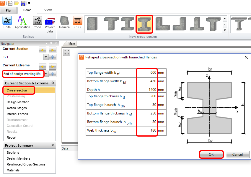 Start with the input of the cross-section. In the Cross-section tab, start with the I-section with haunched flanges in ribbon and type in all dimensions as you can see in the picture.