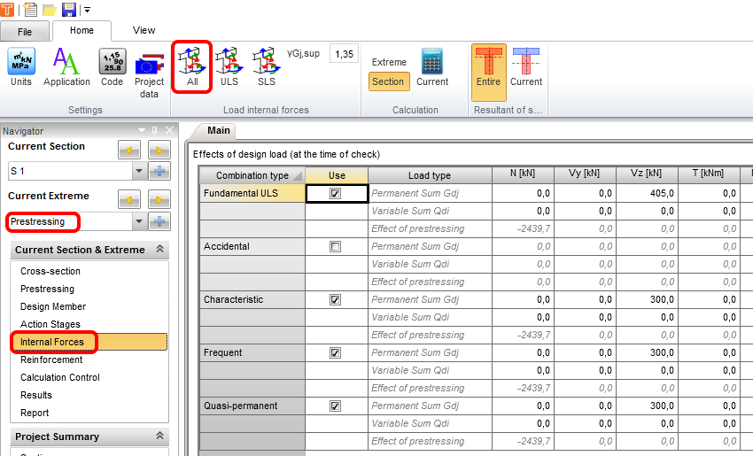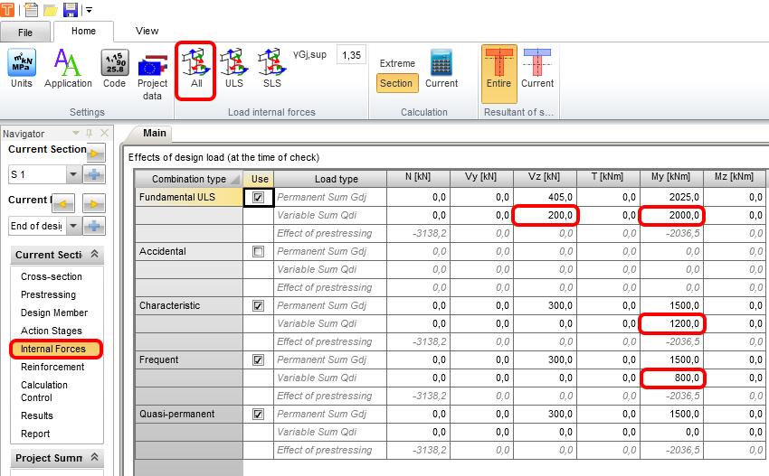 Continue in the Internal forces tab with the transfer of All permanent effects and effects of prestressing. You will complement these values with the design values of variable effects. Please notice that the previous input values have been automatically multiplied by the corresponding partial factors (e.g. 1500*1,35=2025).