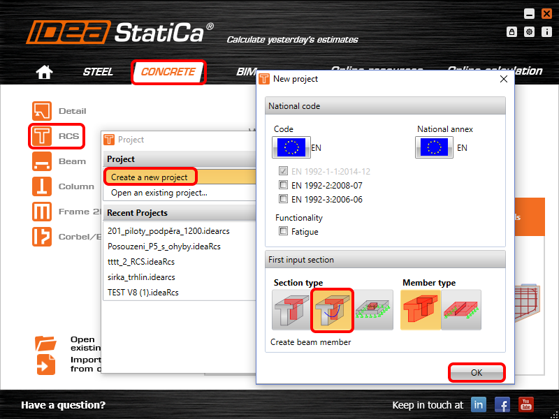Let’s launch IDEA StatiCa, go to the Concrete tab and select the application RCS. Create a new project by clicking Create a new project. In the next dialog, stay with default general Eurocode settings and select a 1D staged/prestressed/composite section as you see on the screenshot.