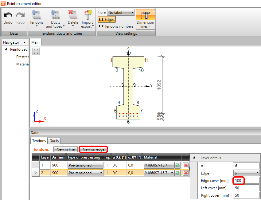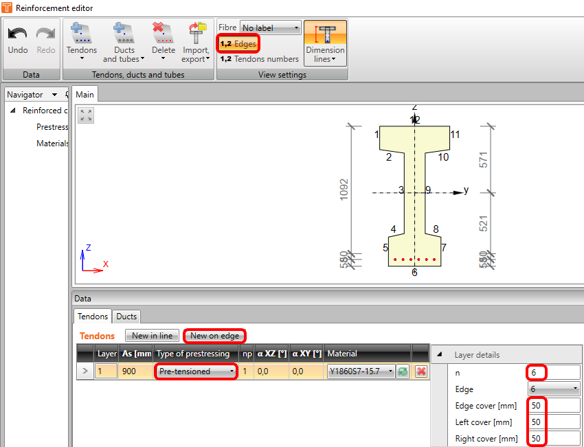 At first, input pre-tensioned tendons as New on edge. To see the edge numbers, turn them on in the ribbon. Change the type to Pre-tensioned and adjust the properties as follows: