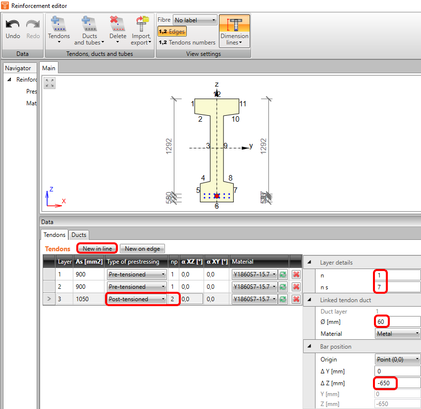 You can combine pre-tensioned tendons with post-tensioned ones in different stages. But their input is done in one place and governed by np (order of prestressing). Let´s add the last tendon as New in line. Change type, np, and properties as seen in the screenshot.