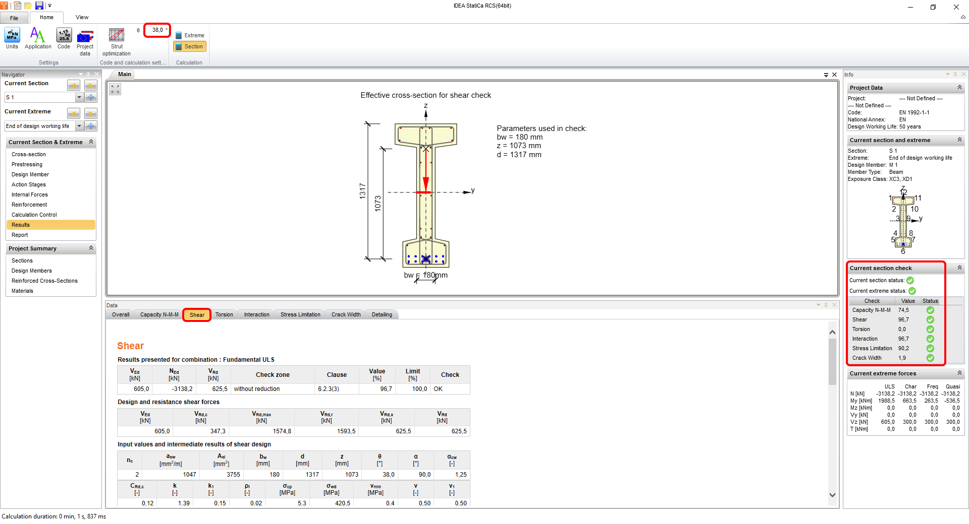 To change that, go to the Shear tab and change the angle manually to 38° or use strut optimization. After the change, both extremes will be recalculated and with all checks passing.