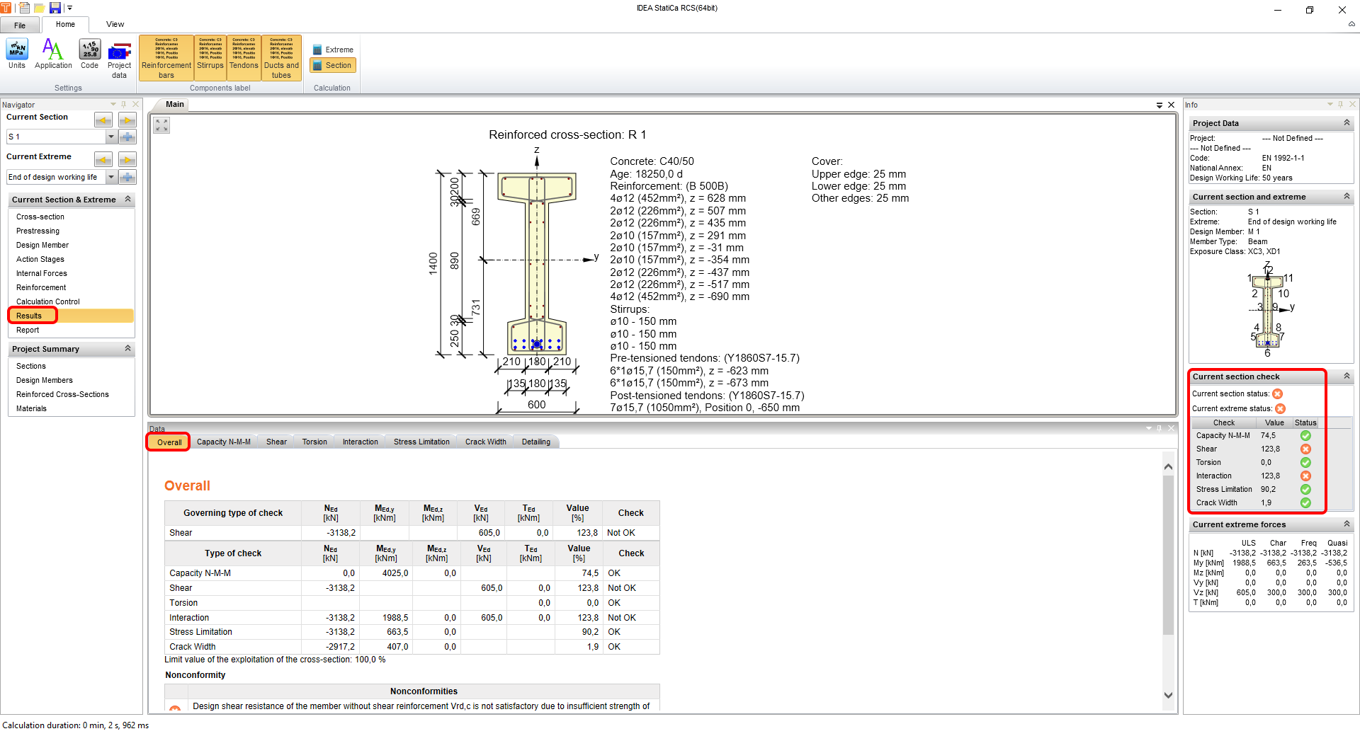 To run the checks, just click on Results in the navigator. The first thing you see after calculations is a summary of all the checks. The fastest way to ensure everything is OK is to look at the right side of the screen. In this example you see, that shear and subsequently interaction checks are not passing. This is the result of the default conservative value of the compressive strut angle.