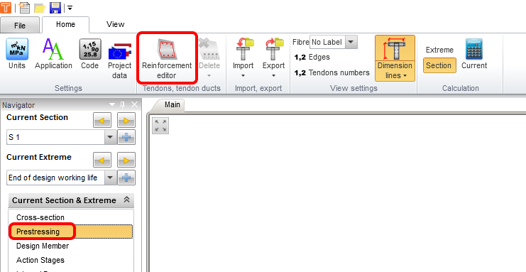 Let´s continue with the introduction of tendons. Switch the tab in Navigator to Prestressing and run Reinforcement editor.