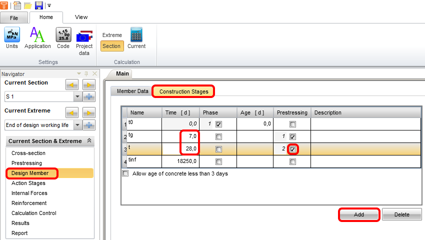 Proceed to the Design member tab in the navigator. Stay with the default values of exposure classes. The important changes for this tutorial are in Construction stages tab. Add one more construction stage and change the time for the second and third construction stage. Also tick the checkbox in the prestressing column for the third construction stage (number 2 appears next to it, which indicates that all tendons with np=2 will be introduced at this stage, in our case post-tensioned tendon).