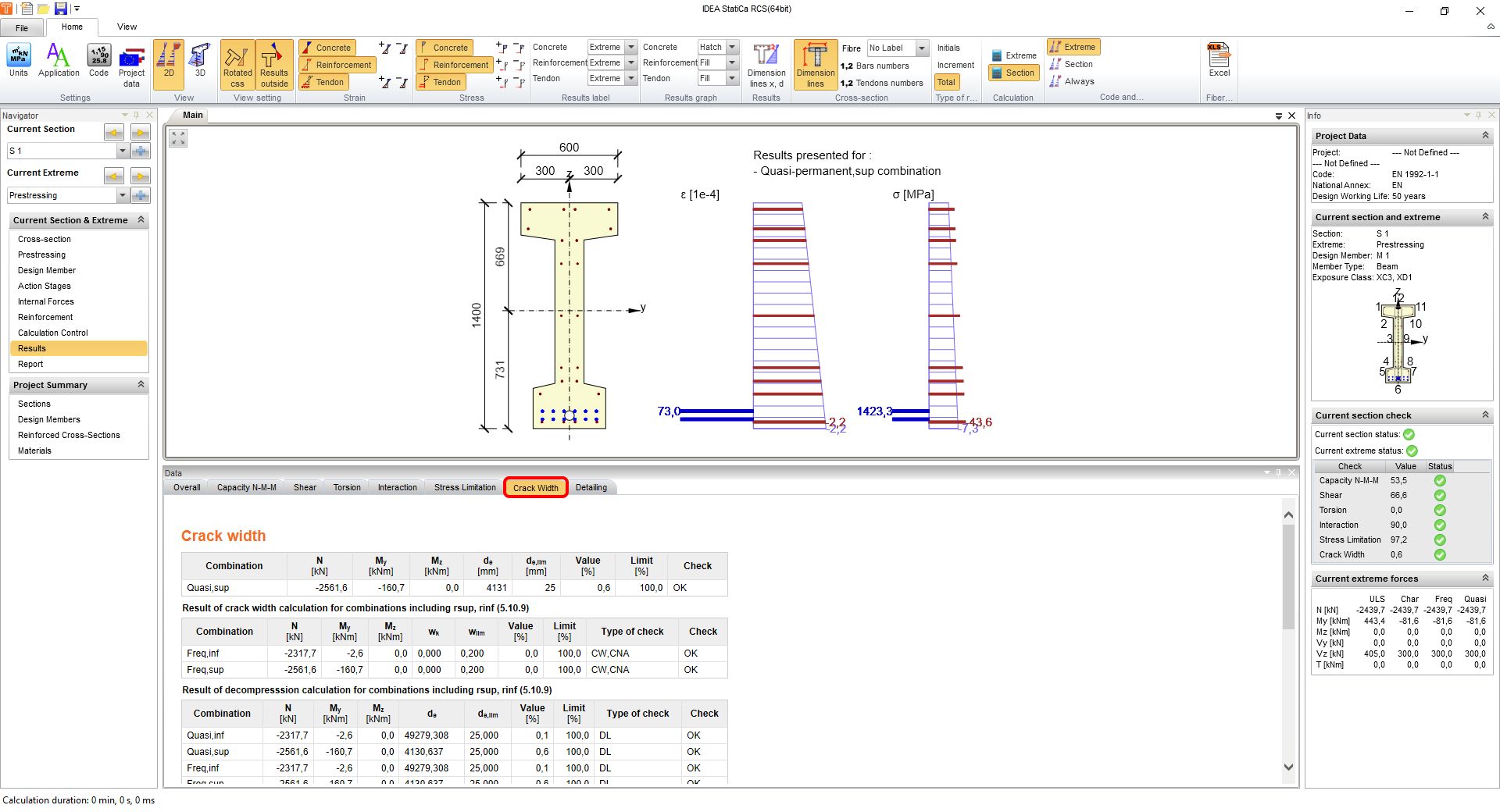 The interesting result at this stage would also be the decompression state which is a part of the crack width results. As you can see in results, IDEA StatiCa RCS automatically checks all the correspondent combinations with the respect to r,inf and r,sup factors according to given exposure classes and national annexes.