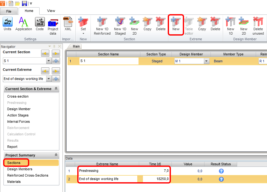 This will create a blank project with the possibility to input prestressed sections. At the beginning you will add one more extreme, so you can check the section at the prestressing stage and also at the end of the design working life. To do that, go to Sections and add a New extreme. At last, rename the extremes and set time to 7 and 18250 days (50 years).