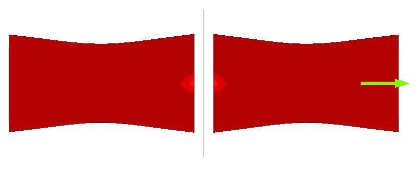 Wenn die Lasten erhöht werden (zur besseren Visualisierung), ist zu erkennen, dass es im Bereich der Bauteilplatte eine Biegeverformung gibt: Die Bauteilplatte verformt sich (Stauchung in der Mitte), die Stirnplatte nicht. Die Längsschubspannungen werden dann aufgrund der an den Plattenrändern entstehenden Dehnungen verursacht.