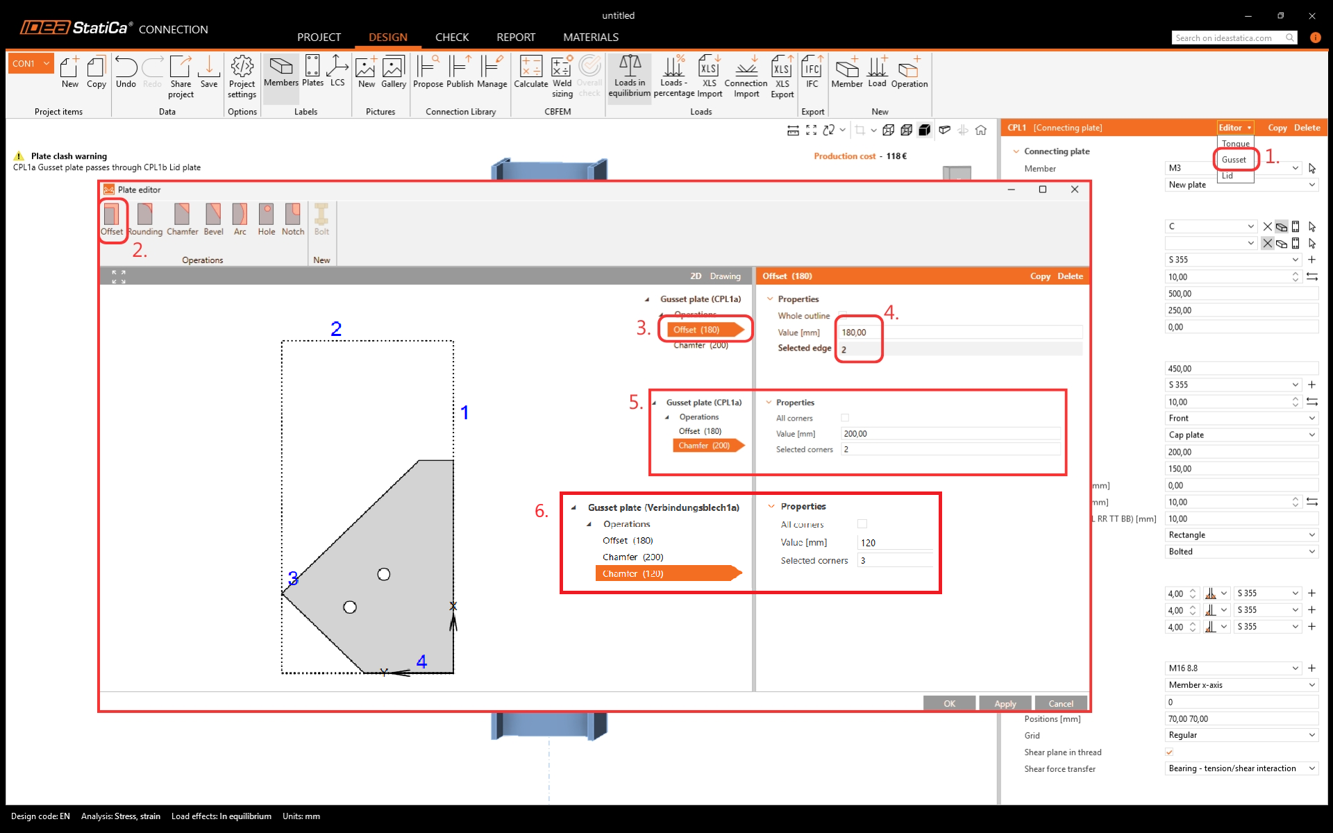 - Bearbeiten Sie die Geometrie des Knotenblechs mit dem Platteneditor, um dieses anzupassen. Zuerst wird die Operation Versatz für die Kante 2, dann die Operation Sym. Abschrägung für die Ecken 2 + 3 verwendet.