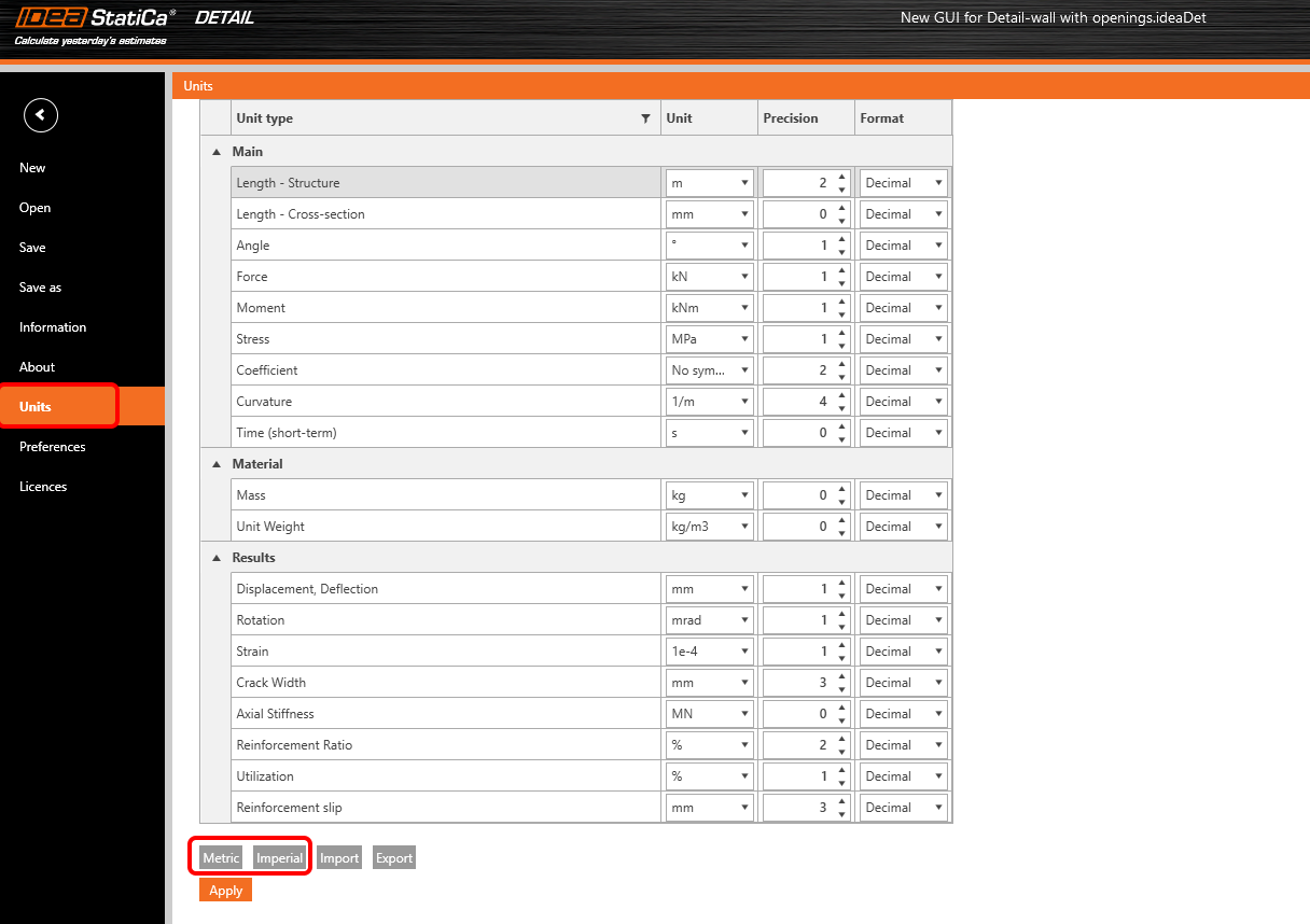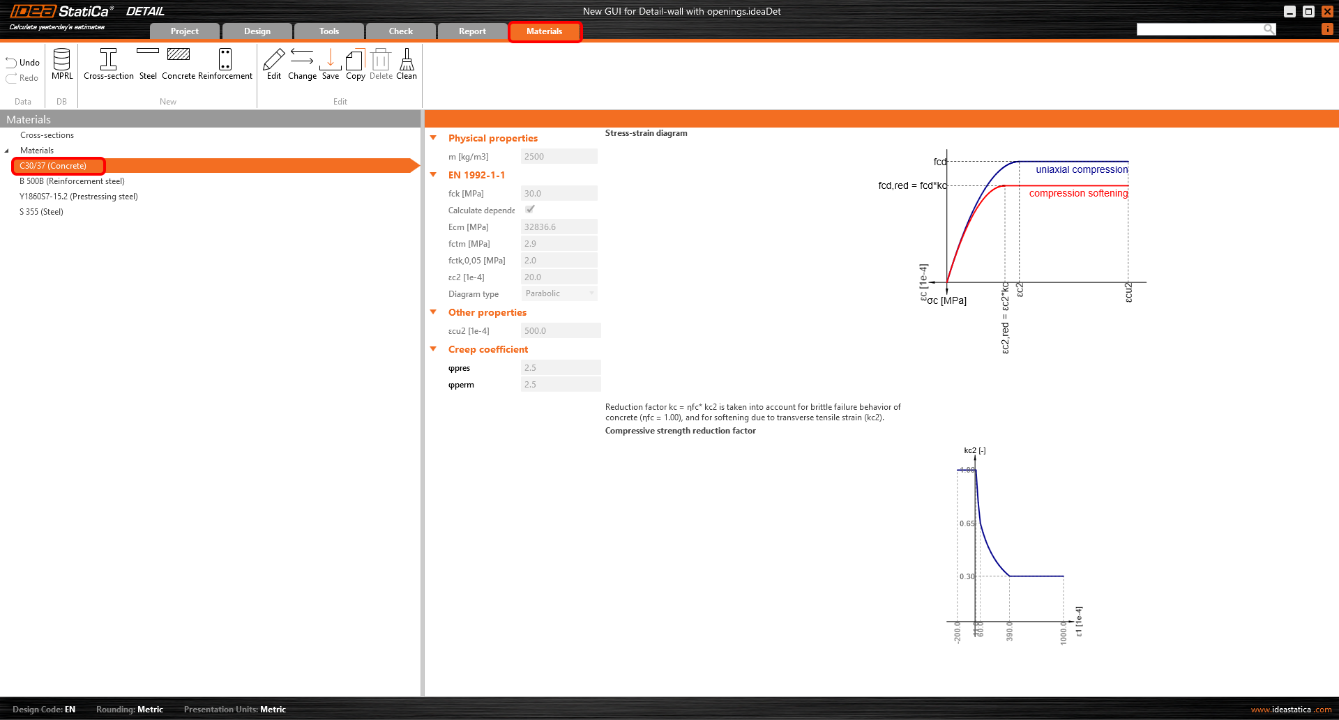 When you need to use user-defined materials for your project, this section is the one for all necessary modifications. Check the diagrams for concrete and reinforcement or prestressing steel. Such materials can be saved to MPRL and then used for all future projects.
