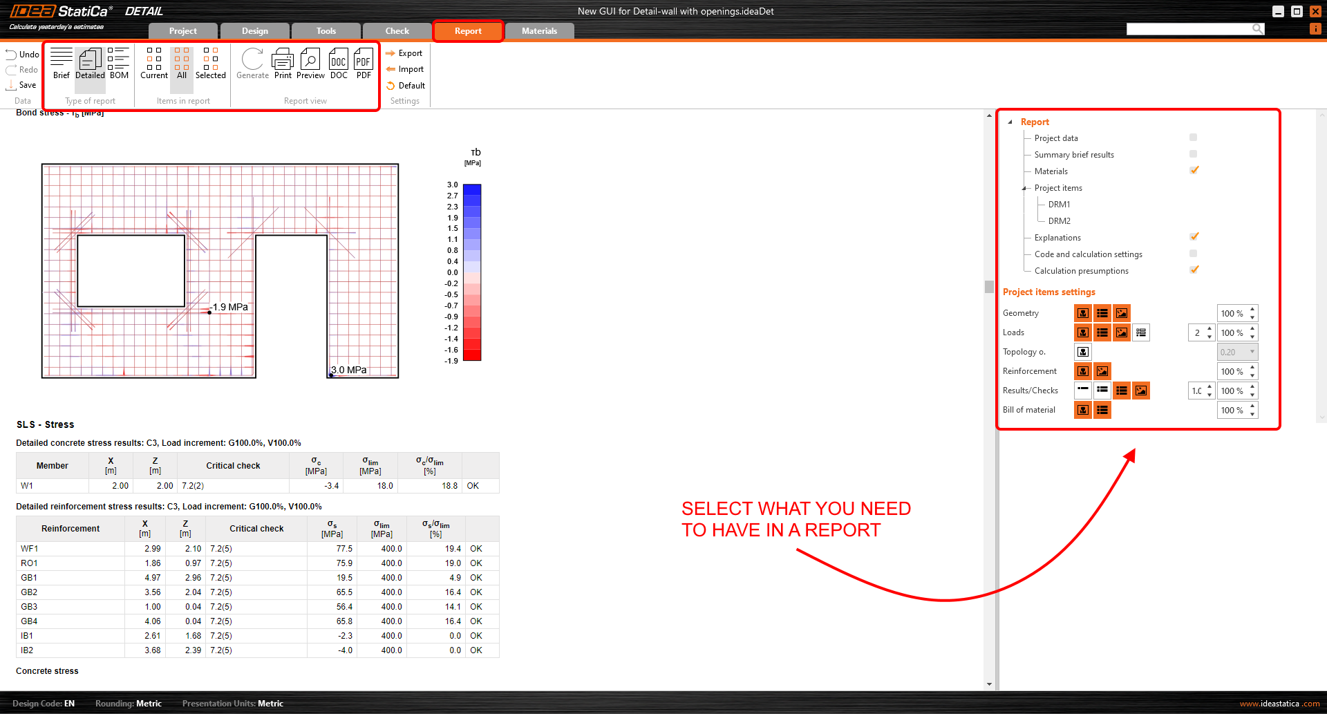 Browsing through individual thorough results for each check for ultimate limit state and serviceable limit states brings you the needed answers. And, it is up to you if you want to see results separately for concrete, reinforcement, or prestressing tendons. Everything is clearly displayed in the main graphic scene and also in the tables.
