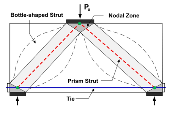 One of the most commonly used methods is the equivalent truss method, which you know by the names of the Strut and Tie method (S&T) and the stress fields method. The basic assumption of the Strut and Tie model is that the tensile strength of concrete is negligible. A simple truss model of the behavior of the D-region in the ultimate limit state is built from elements acting in compression and tension.