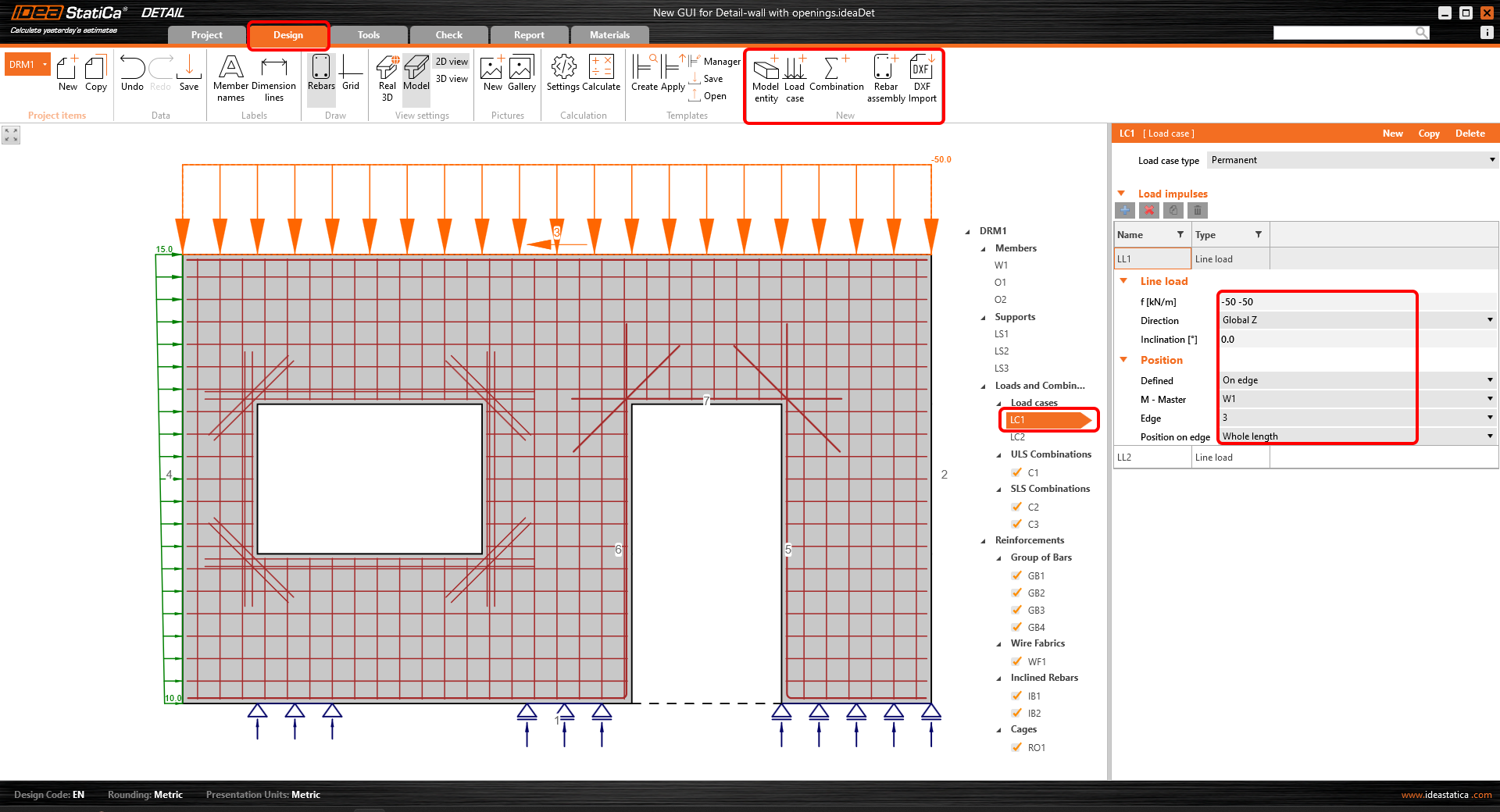 As the title suggests, this section is dedicated to everything related to the structure's design. Here, you define the model's elements (entities), their geometry, and reinforcement. And also the load cases and corresponding combinations for ultimate and serviceable limit states.